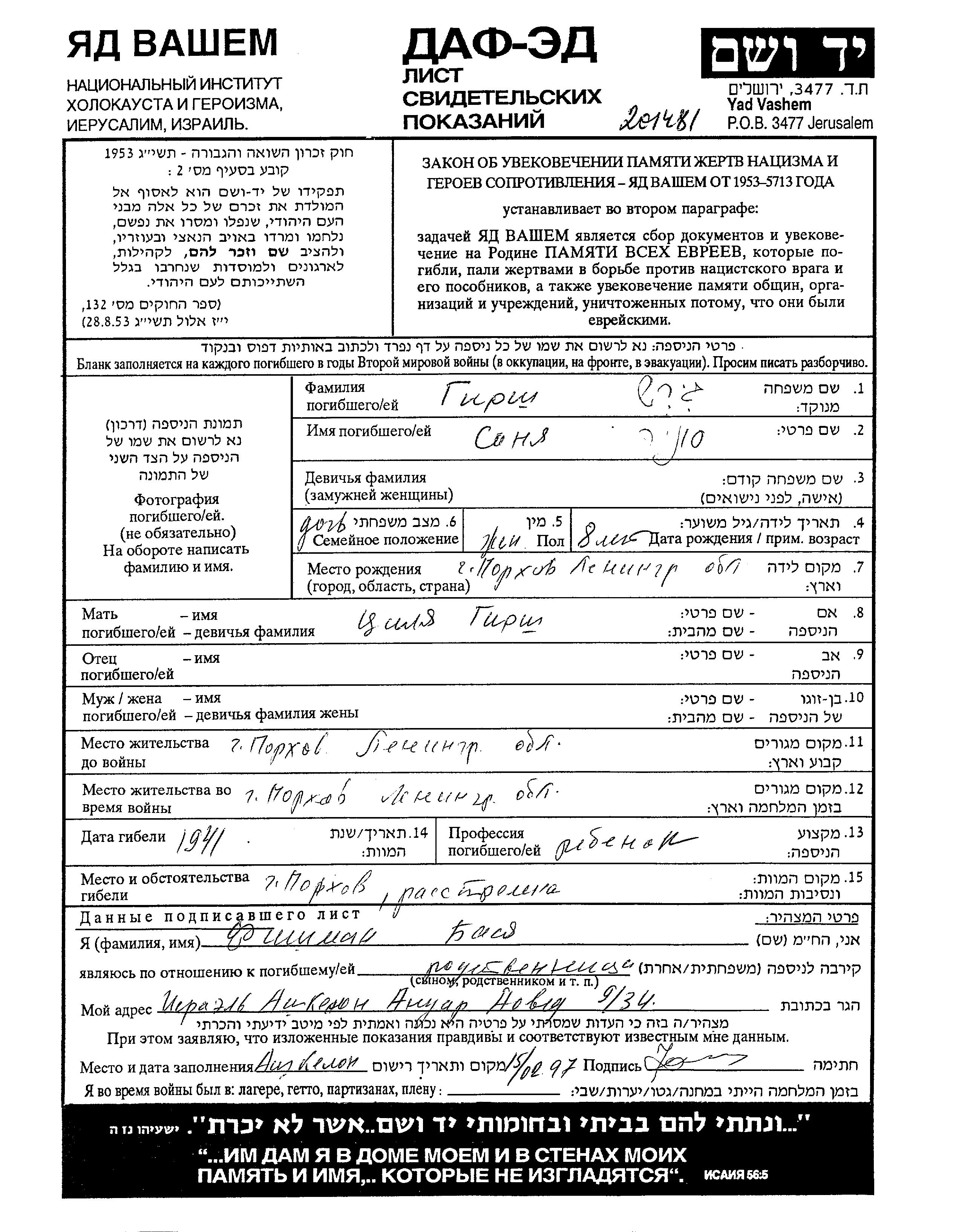 Sonya Girsh was born in Porkhov, Russia (USSR), 1933 to Tzilya. She was child. Prior to WWII she lived in Porkhov, Russia (USSR). During the war she was in Porkhov, Russia (USSR). Sonya was murdered in the Shoah. Place of death: Porkhov, Russia (USSR), 1941.