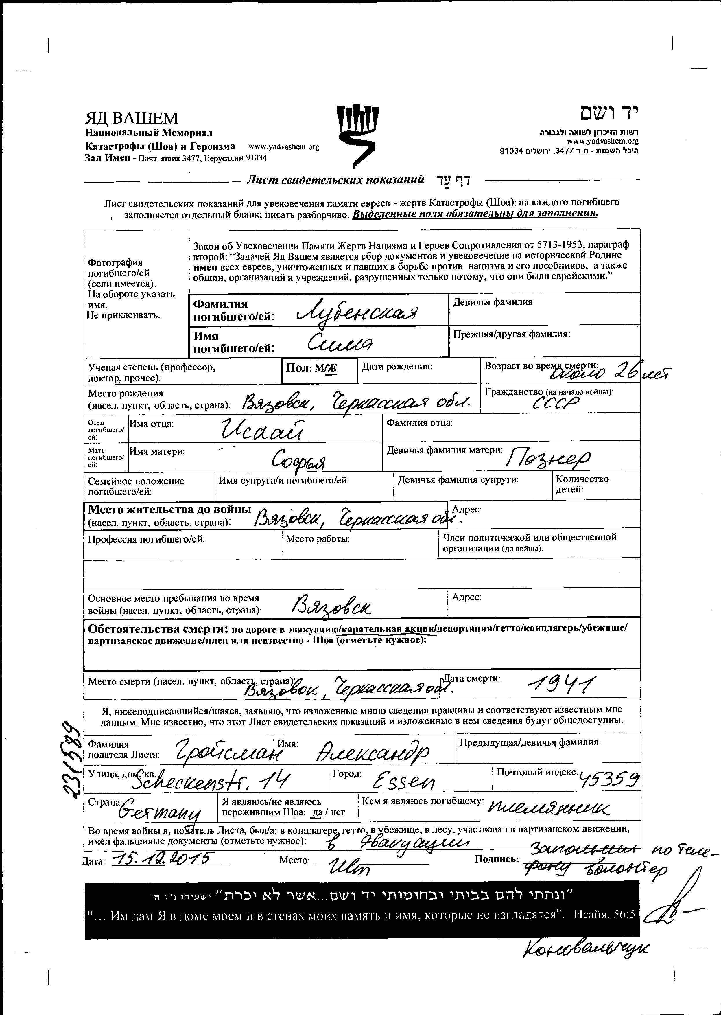 Sima Lubenskaya was born in Vyazovok, Ukraine (USSR) to Isaay and Sofya nee Pozner. Prior to WWII she lived in Vyazovok, Ukraine (USSR). During the war she was in Vyazovok, Ukraine (USSR). Sima was murdered in the Shoah. Place of death: Vyazovok, Ukraine (USSR), 1941.