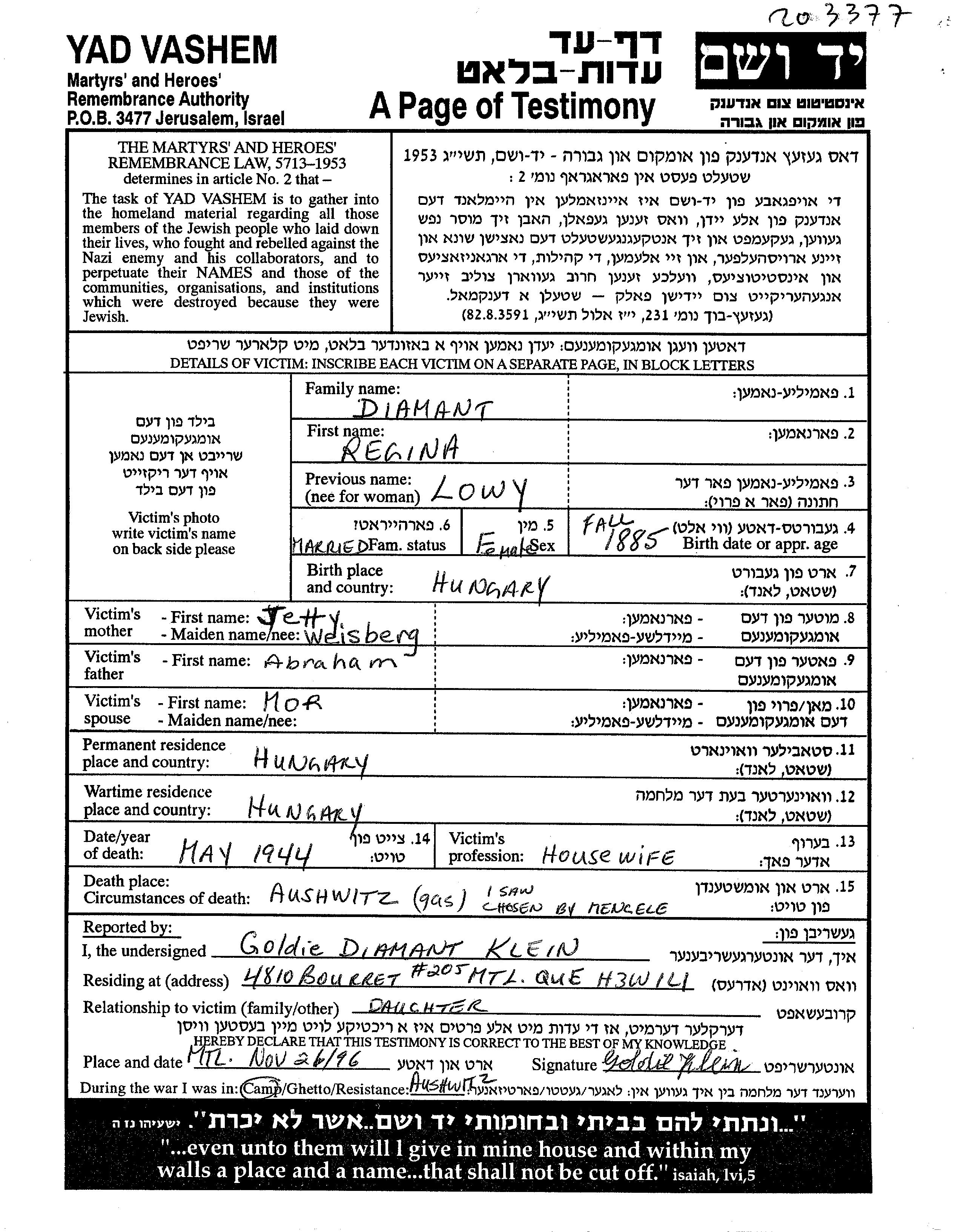 Regina Diamant nee Lowy was born in Hungary, 1885 to Abraham and Jetty nee Weisberg. She was a housewife and married to Mor. Prior to WWII she lived in Hungary. During the war she was in Hungary.