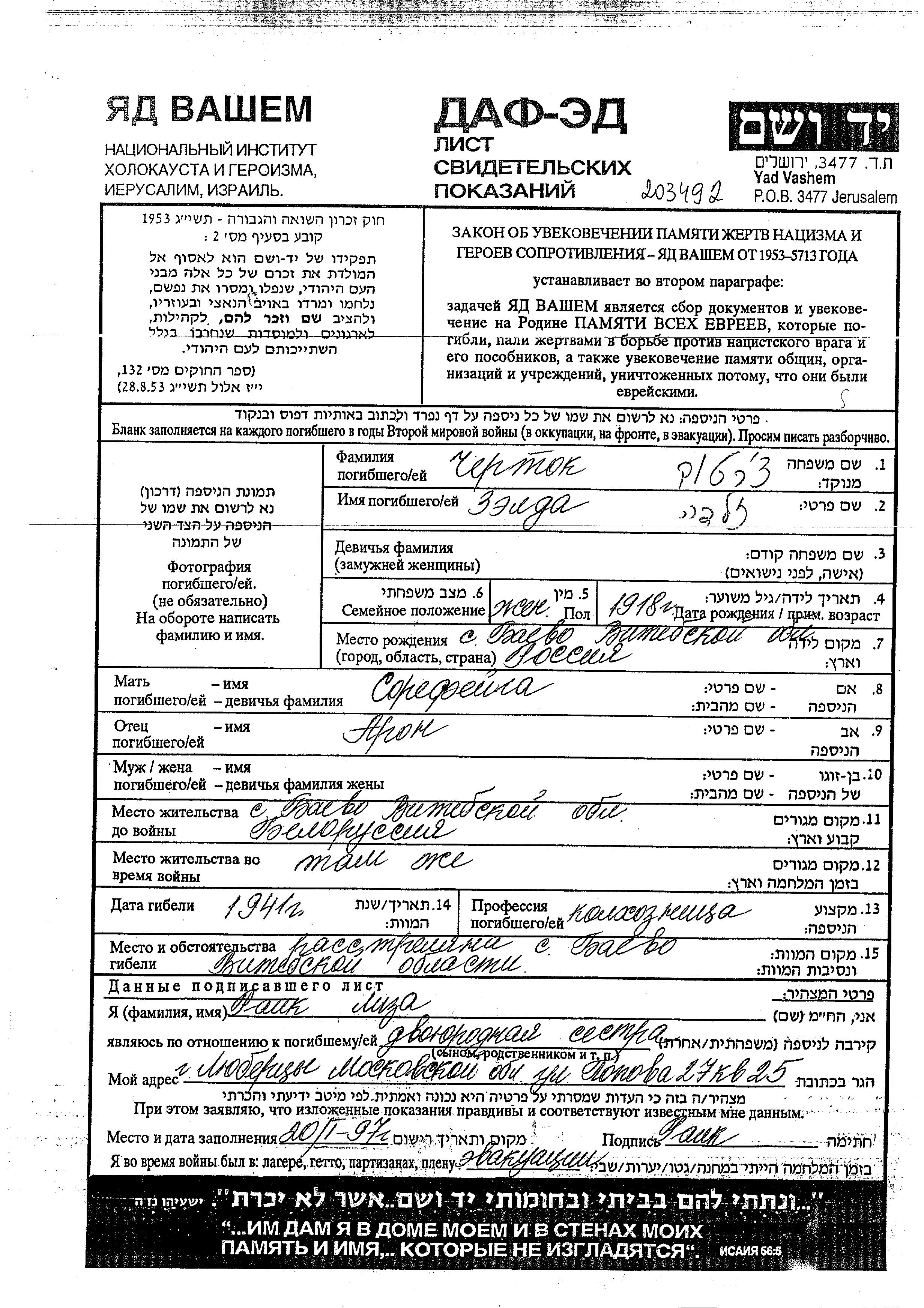 Zelda Chertok was born in Bayevo, Belorussia (USSR), 1918 to Aron and Sore Feiga. She was a kolkhoznik / kolkhoznitza. Prior to WWII she lived in Bayevo, Belorussia (USSR). During the war she was in Bayevo, Belorussia (USSR). Zelda was murdered in the Shoah. Place of death: Bayevo, Belorussia (USSR), 1941.