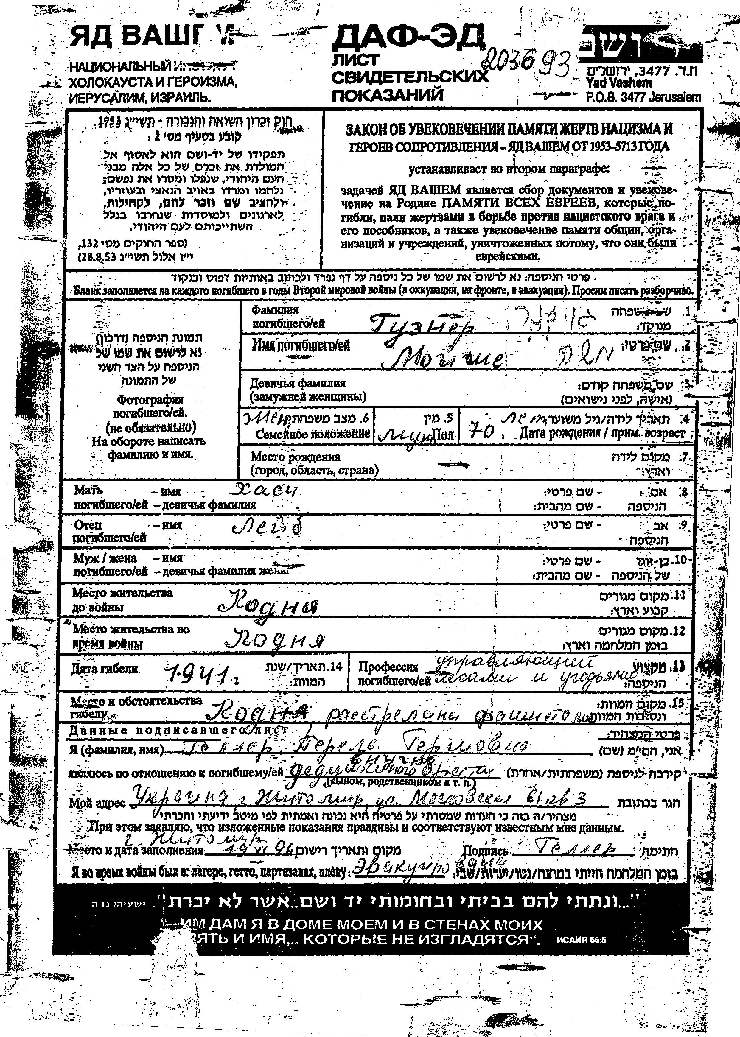 Moishe Guzner was born, 1871 to Leib and Khasi. He was a weaver and married. Prior to WWII he lived in Kodnya, Ukraine (USSR). During the war he was in Kodnya, Ukraine (USSR). Moishe was murdered in the Shoah. Place of death: Kodnya, Ukraine (USSR), 1941.