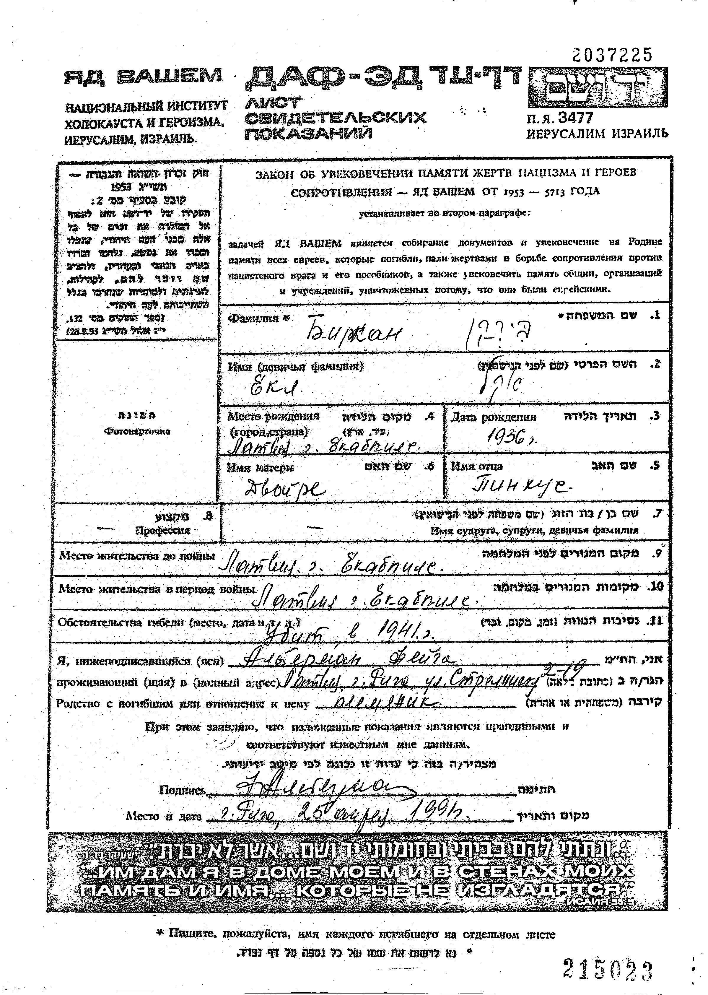 Yekl Birkan Birken was born in Jekabpils, Latvia, 1936 to Pinkhus and Dvoire nee Berger. He was child. Prior to WWII he lived in Jekabpils, Latvia. During the war he was in Jekabpils, Latvia. Yekl was murdered in the Shoah. Place of death: Jekabpils, Latvia, 1941.