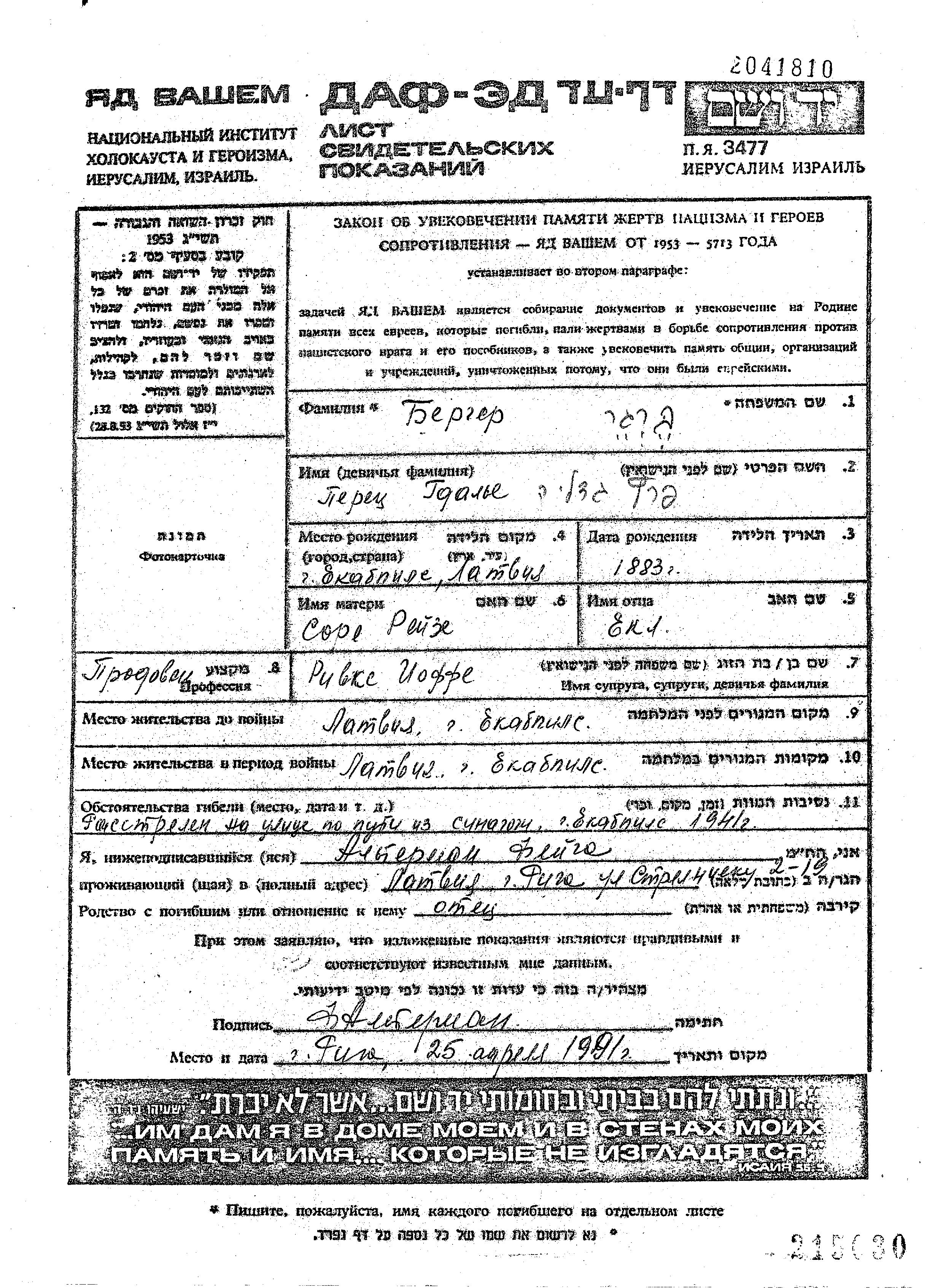 Gdalie Peretz Berger was born in Jekabpils, Latvia, 1883 to Yekl and Sore Reize. He was a butcher and married to Rivke. Prior to WWII he lived in Jekabpils, Latvia. During the war he was in Jekabpils, Latvia. Gdalie Peretz was murdered in the Shoah. Place of death: Jekabpils, Latvia, 1941.