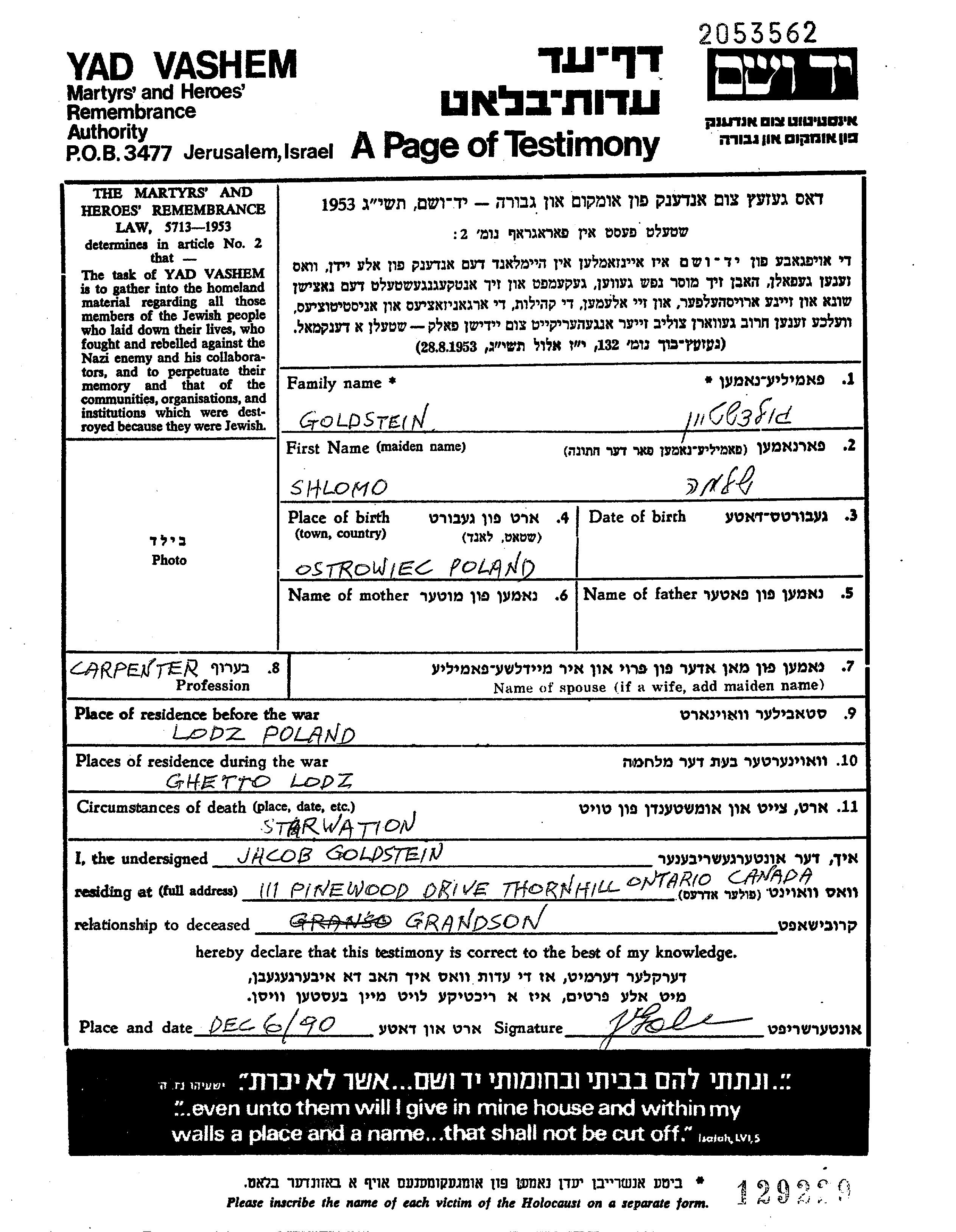 Goldstein Shlomo Lodz, Poland Page of Testimony