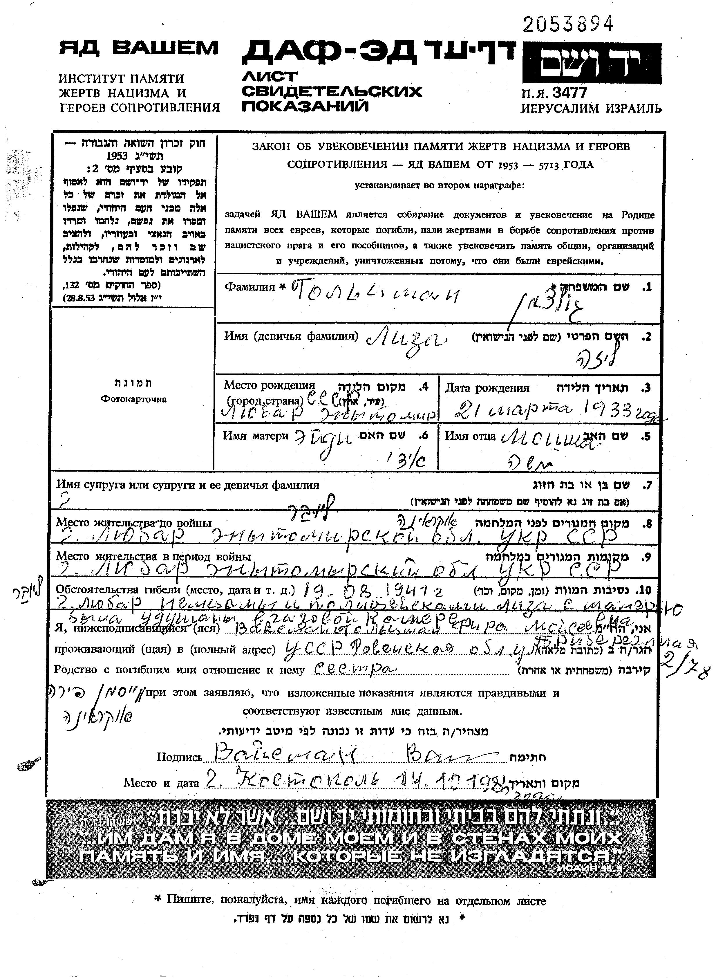 Liza Goltzman was born in Lyubar, Ukraine (USSR), 1933 to Moshka and Eidi. She was child. Prior to WWII she lived in Lyubar, Ukraine (USSR). During the war she was in Lyubar, Ukraine (USSR). Liza was murdered in the Shoah. Place of death: Lyubar, Ukraine (USSR), 19/08/1941.
