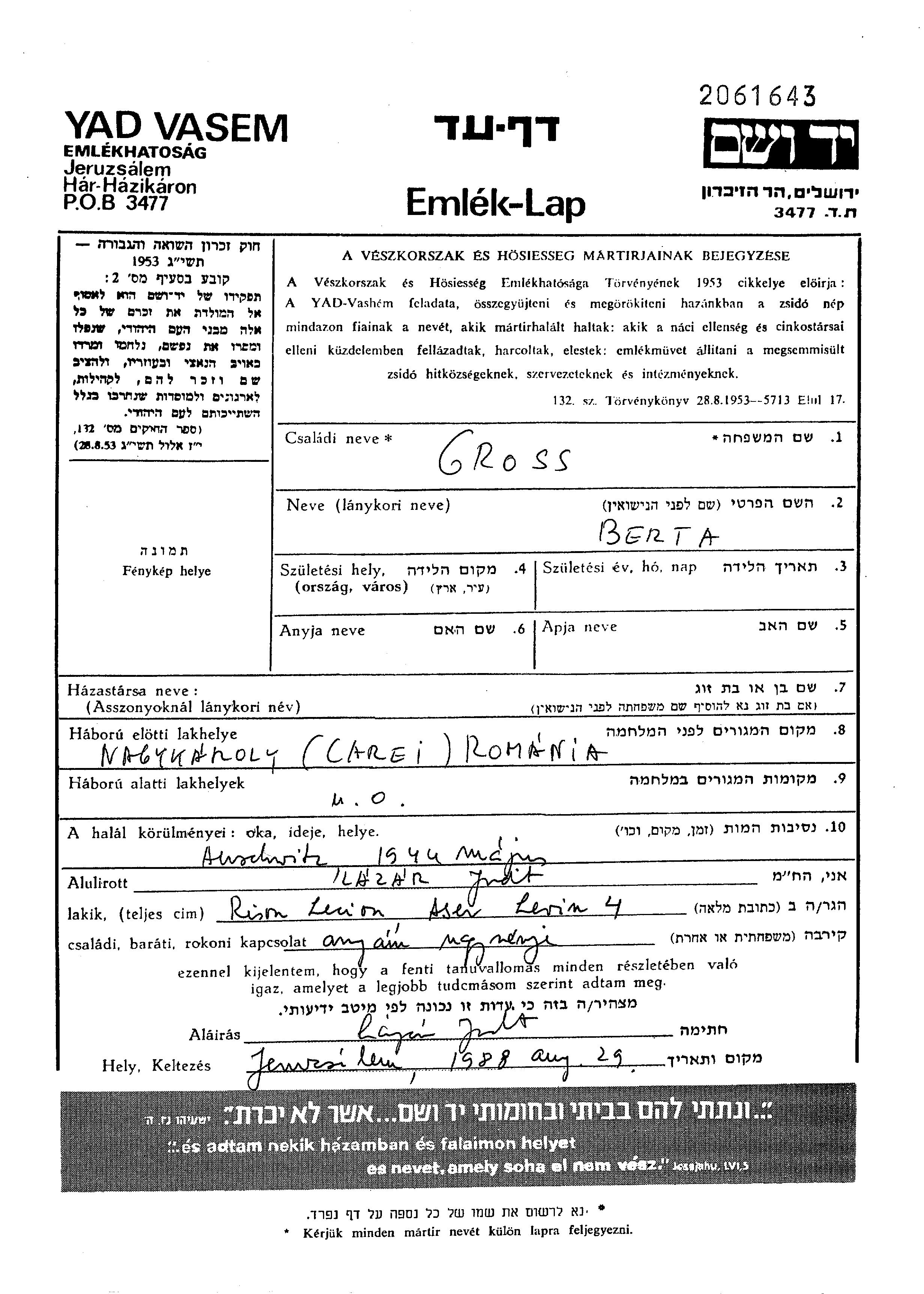 Gross Berta Nagykaroly, Romania Page of Testimony