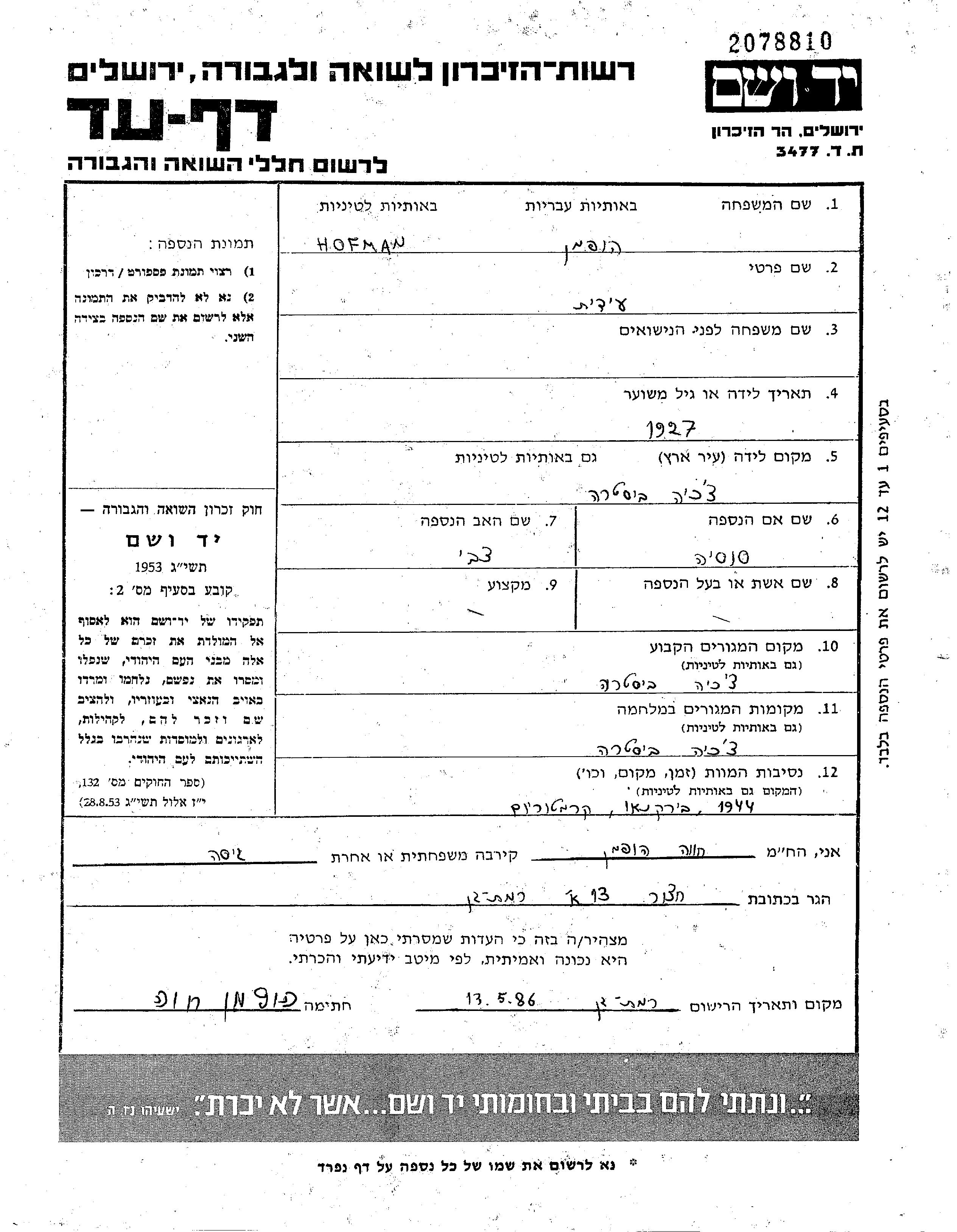 Idit Hofman was born in Bistre, Czechoslovakia, 1927 to Tzvi and Sosia nee Zisovitz. She was child. Prior to WWII she lived in Bistre, Czechoslovakia. During the war she was in Bistre, Czechoslovakia. Idit was murdered in the Shoah. Place of death: Birkenau, Poland, 1944.