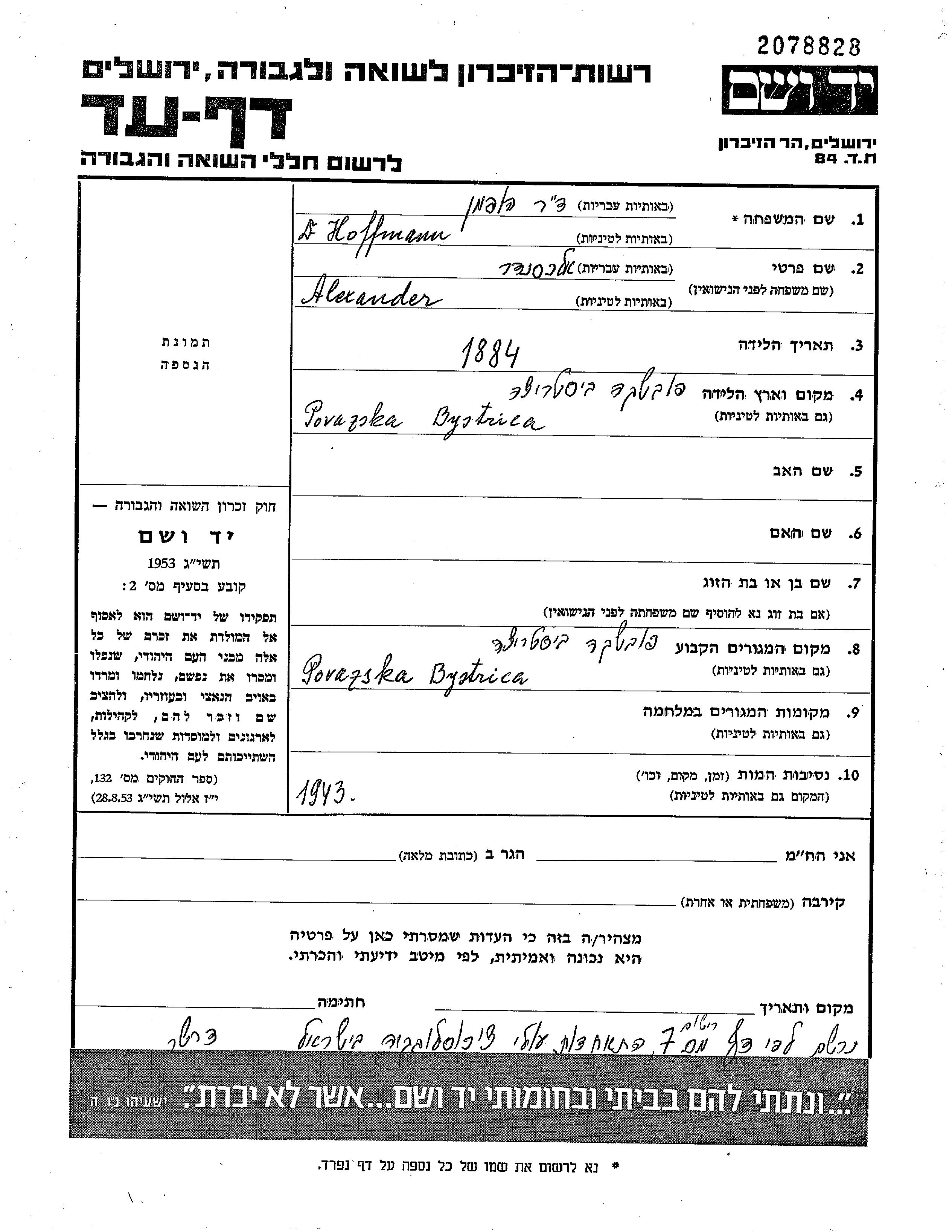 Dr. Alexander Hoffmann was born in Pov Bystrica, Czechoslovakia, 1884. Prior to WWII he lived in Pov Bystrica, Czechoslovakia. Dr. Hoffmann was murdered in the Shoah. Place of death: unknown, 1943.