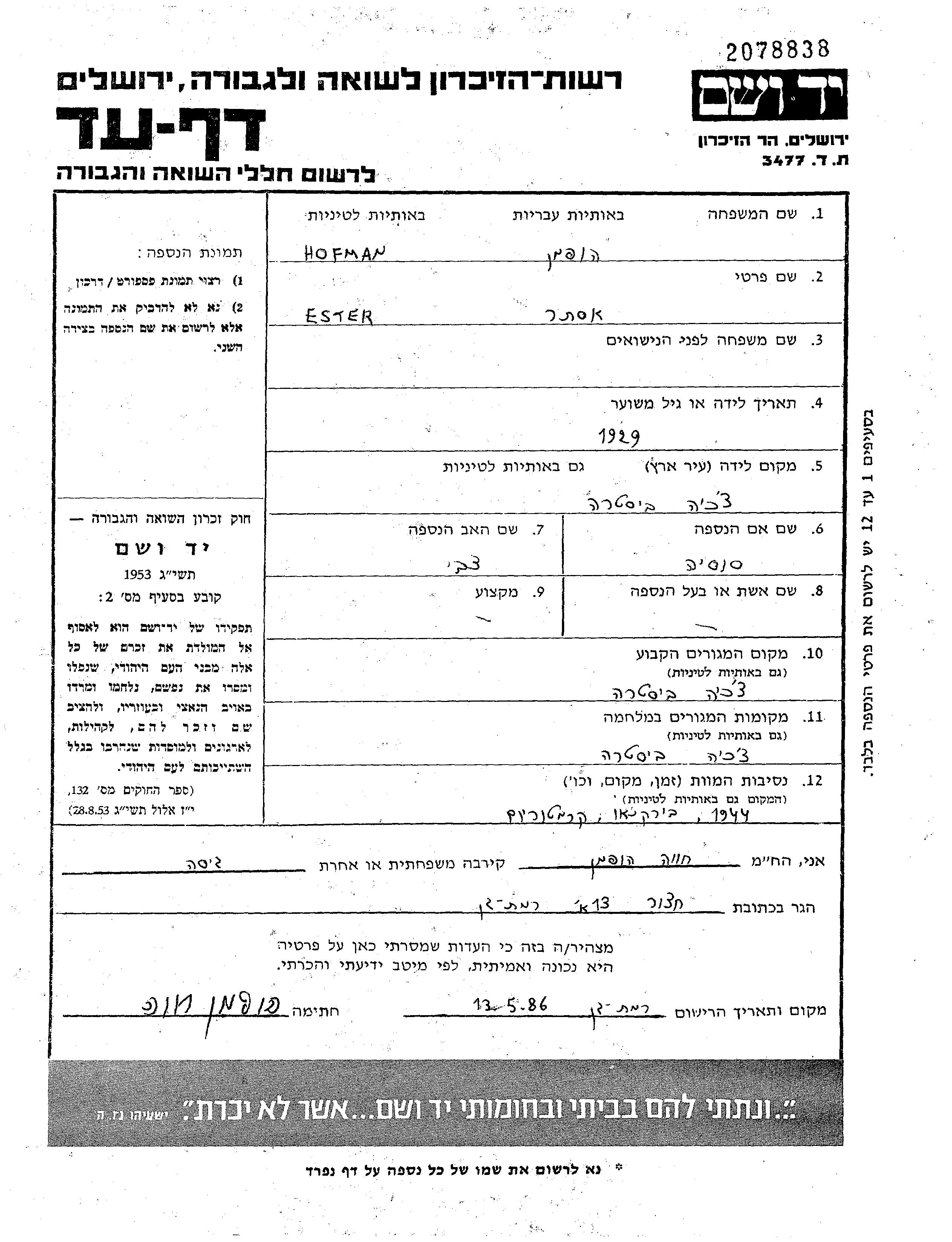 Ester Hofman was born in Bistre, Czechoslovakia, 1929 to Tzvi and Sosia nee Zisovitz. She was child. Prior to WWII she lived in Bistre, Czechoslovakia. During the war she was in Bistre, Czechoslovakia. Ester was murdered in the Shoah. Place of death: Birkenau, Poland, 1944.