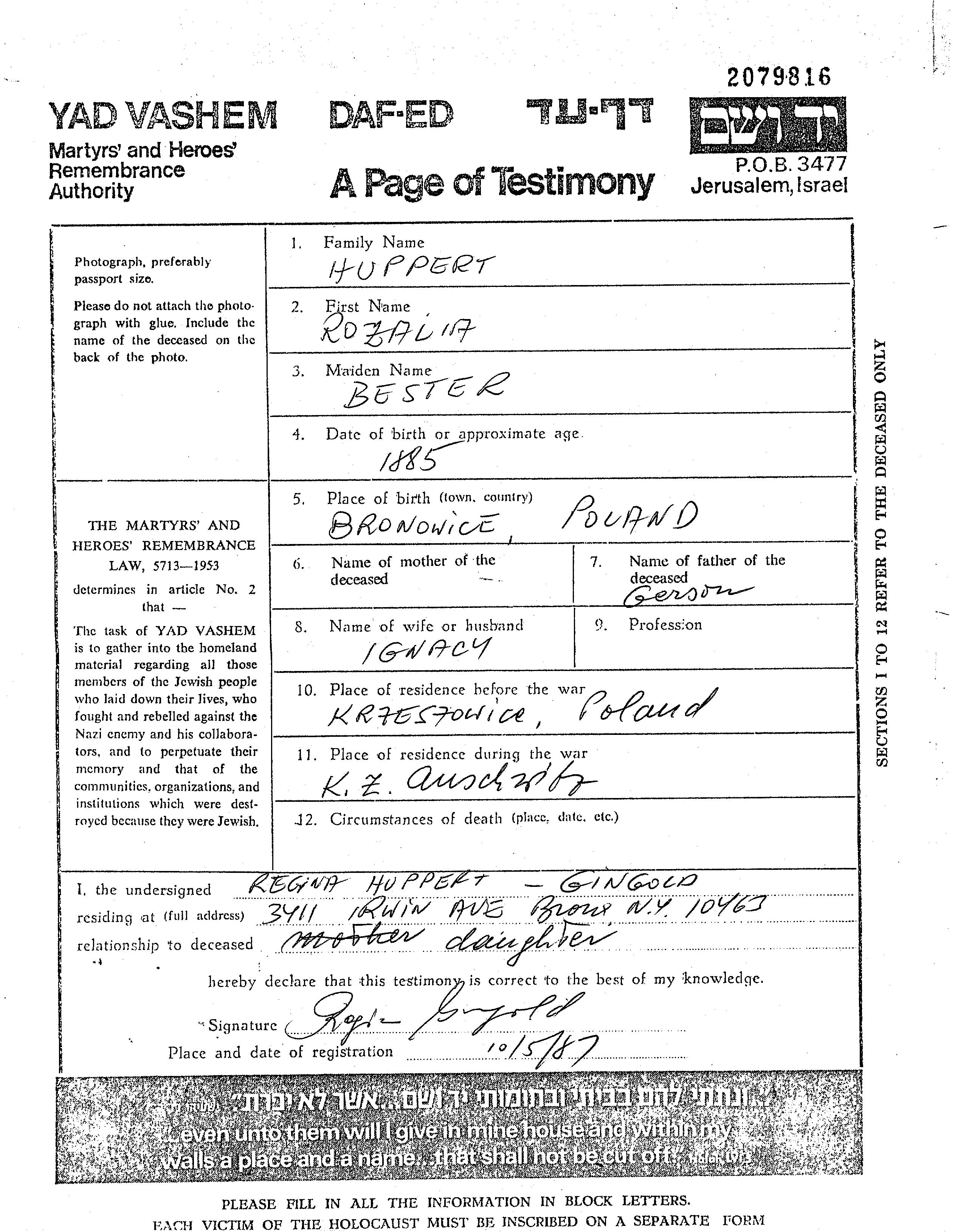 Rozalia Huppert nee Bester was born in Bronowice, Poland, 1885 to Gerson. She was married to Ignacy. Prior to WWII she lived in Krzeszowice, Poland. During the war she was in Poland. Rozalia was murdered in the Shoah. Place of death: Auschwitz, Poland.