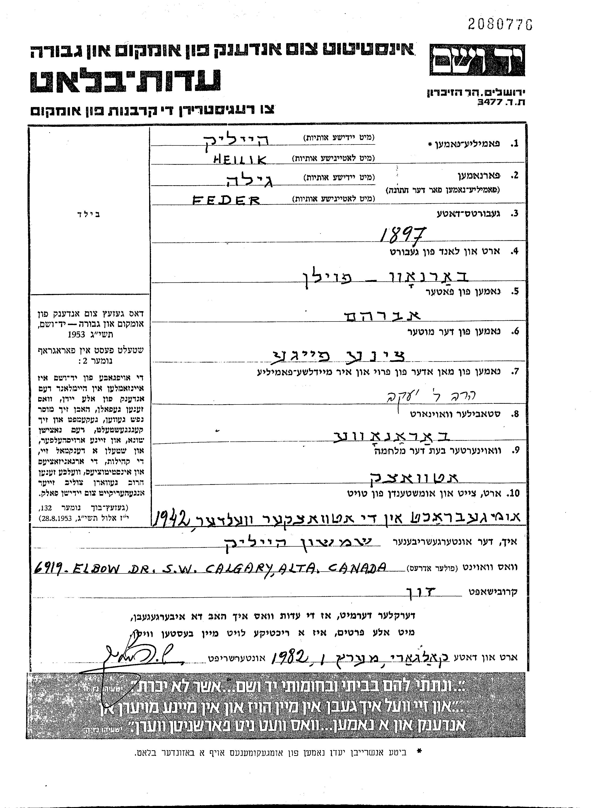 Gila Heilik nee Feder was born in Baranowo, Poland, 1897 to Avraham and Tzine Feiga. She was married to Yaakov. Prior to WWII she lived in Baranowo, Poland. During the war she was in Otwock, Poland. Gila was murdered in the Shoah. Place of death: Otwock, Poland, 1942.