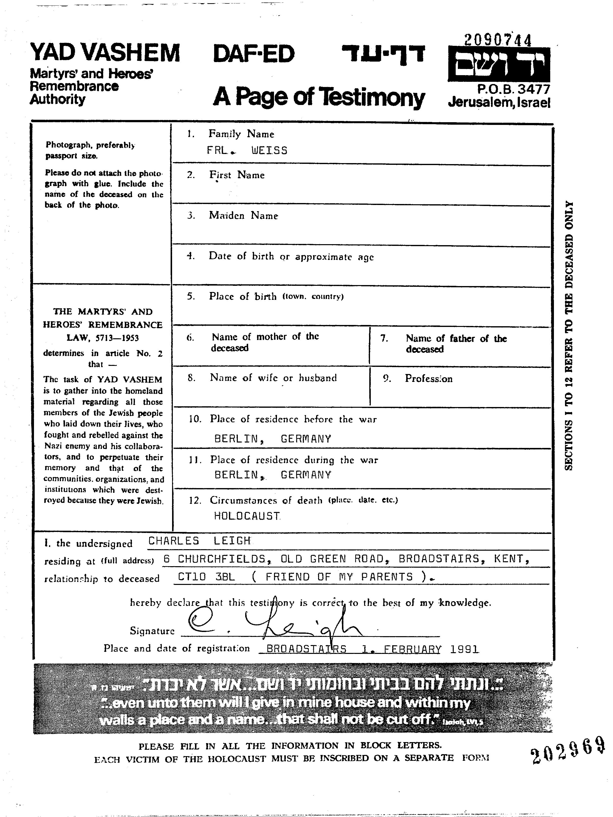 Weiss First name unknown Berlin, Germany Page of Testimony