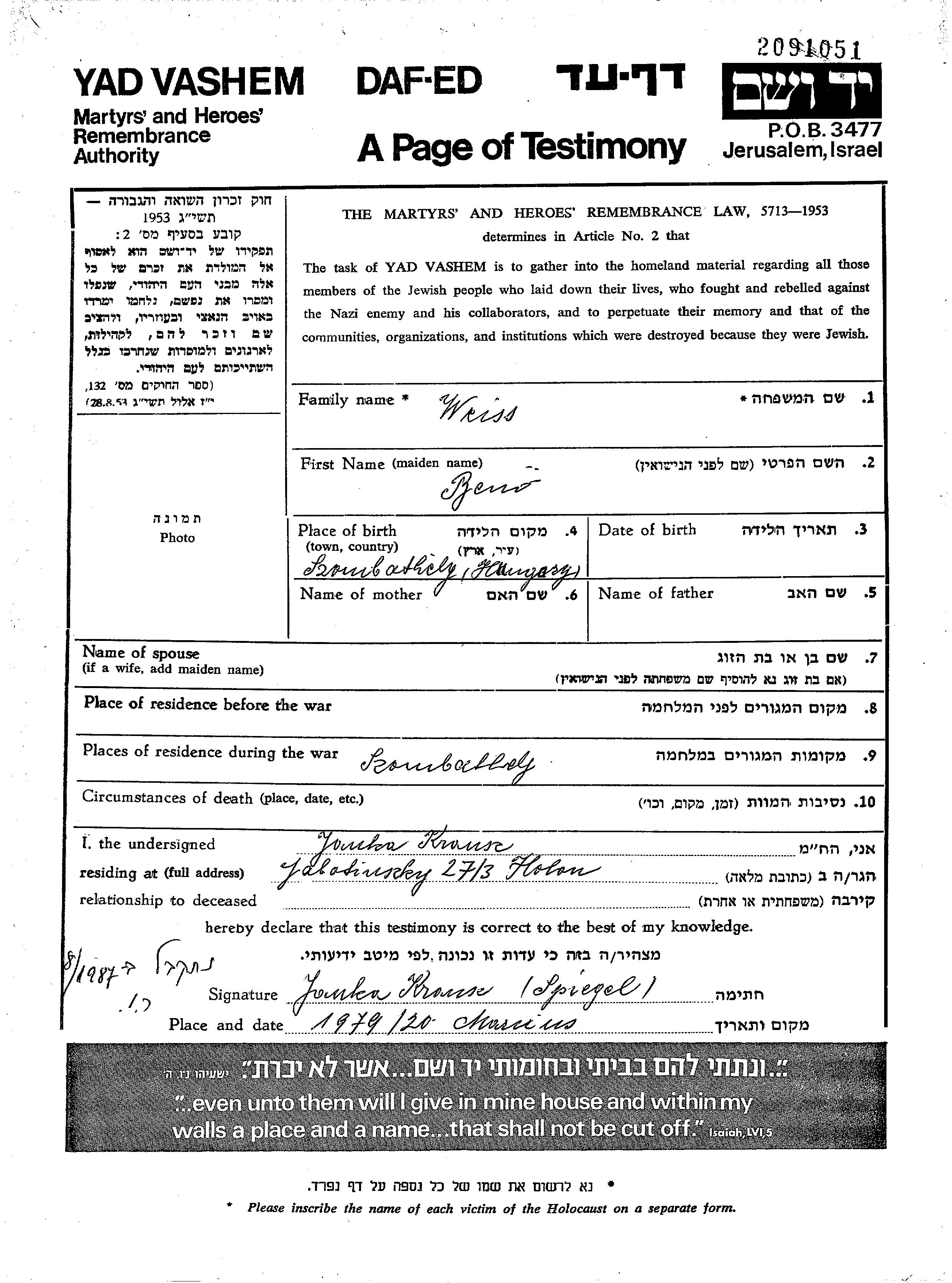 Weiss Beno Szombathely, Hungary Page of Testimony