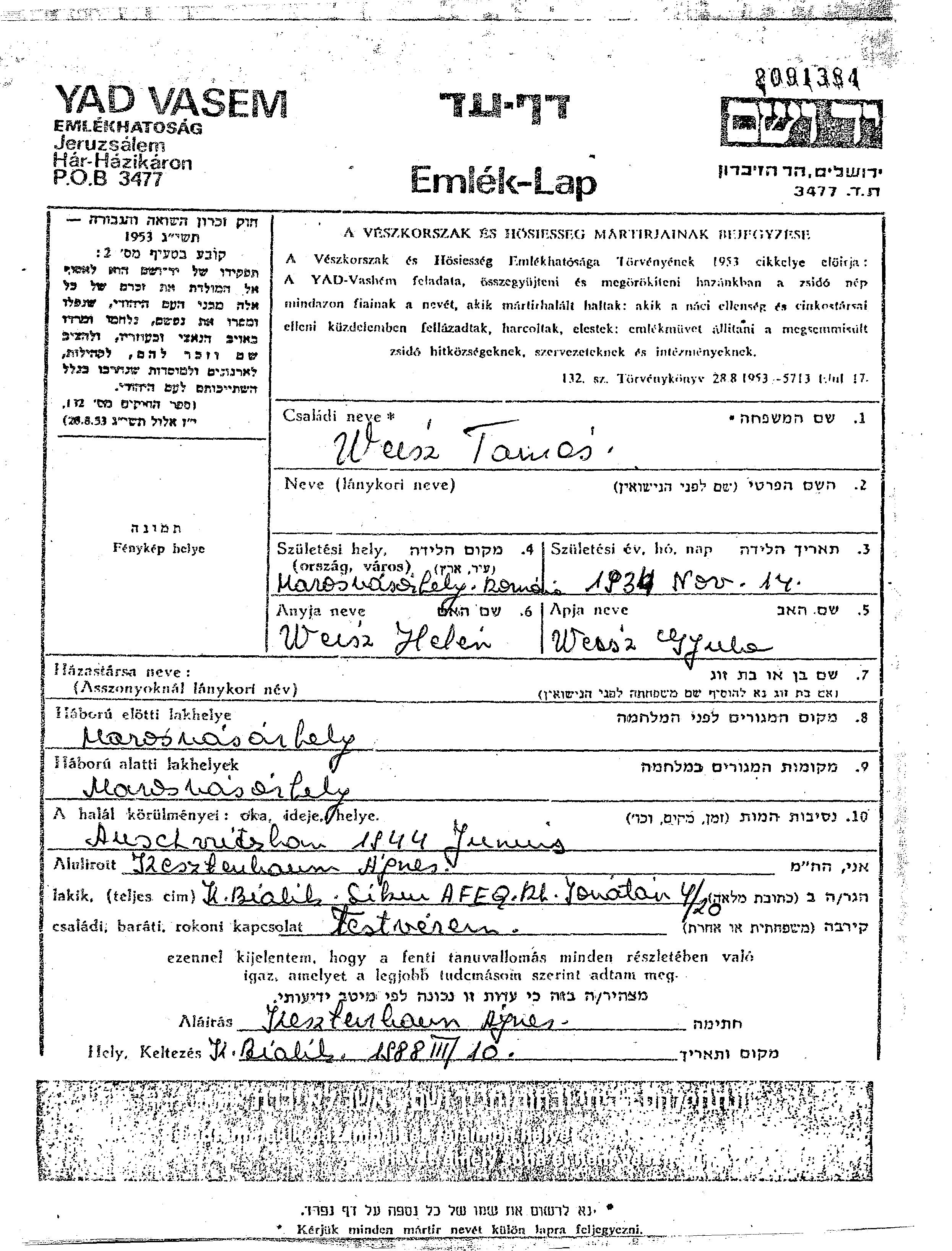 Weisz Tamas 1934 Marosvasarhely, Romania Page of Testimony (digital)