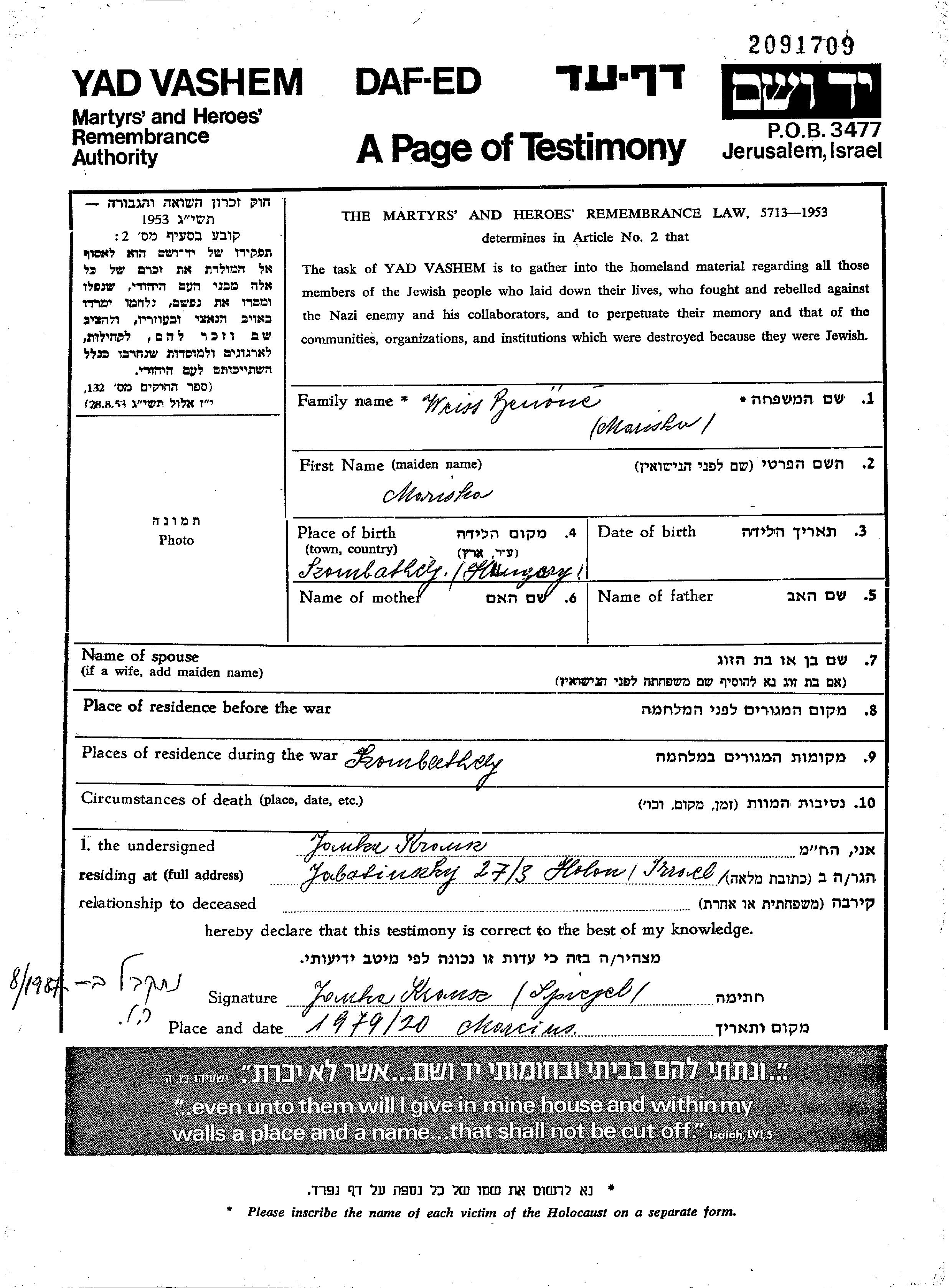 Weiss Mariska Szombathely, Hungary Page of Testimony