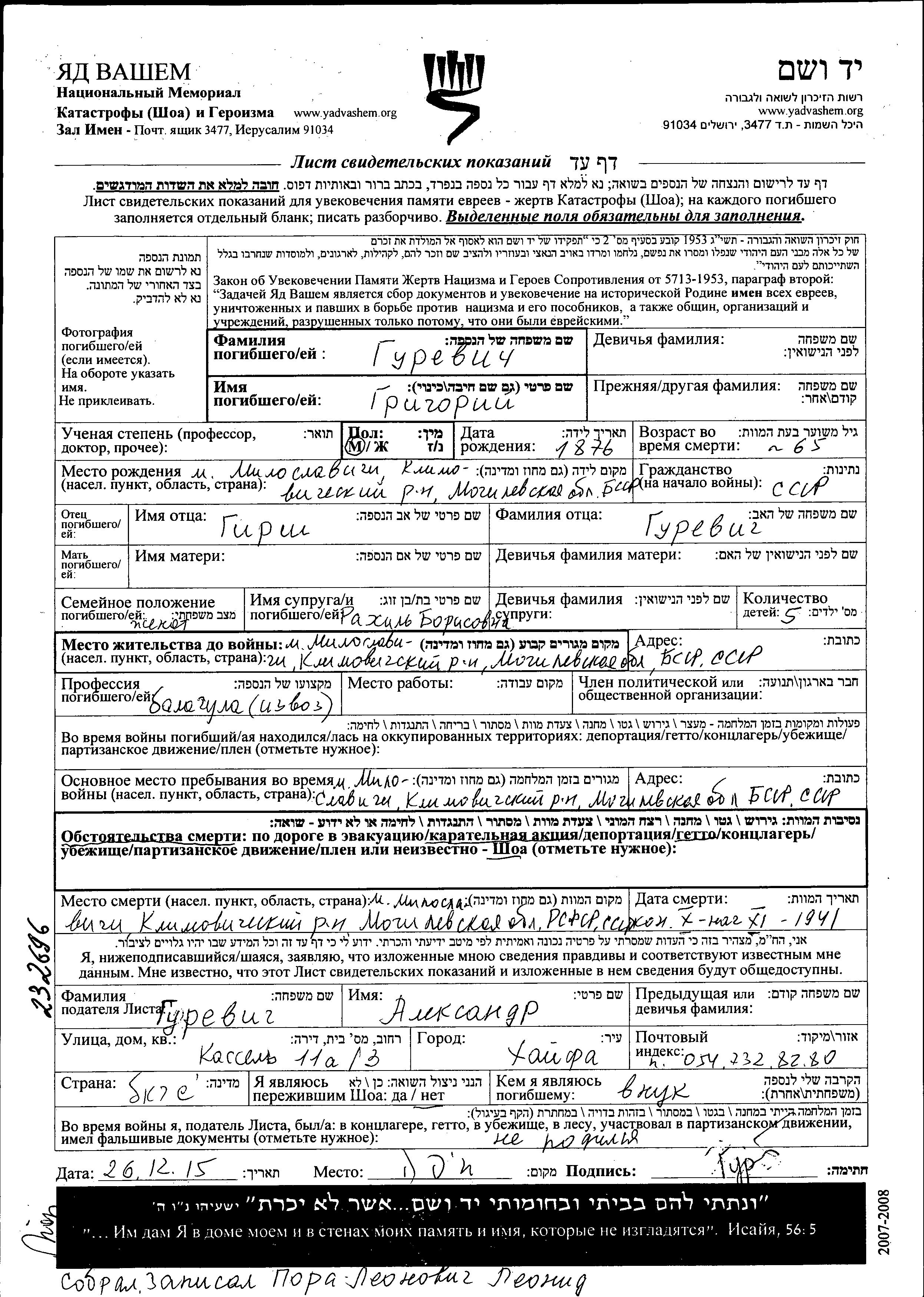 Grigoriy Gurevich was born in Miloslavichi, Belorussia (USSR), 1876 to Girsh. He was a waggoner and married to Rakhil. Prior to WWII he lived in Miloslavichi, Belorussia (USSR). During the war he was in Miloslavichi, Belorussia (USSR). Grigoriy was murdered in the Shoah. Place of death: Miloslavichi, Belorussia (USSR), 10/1941.