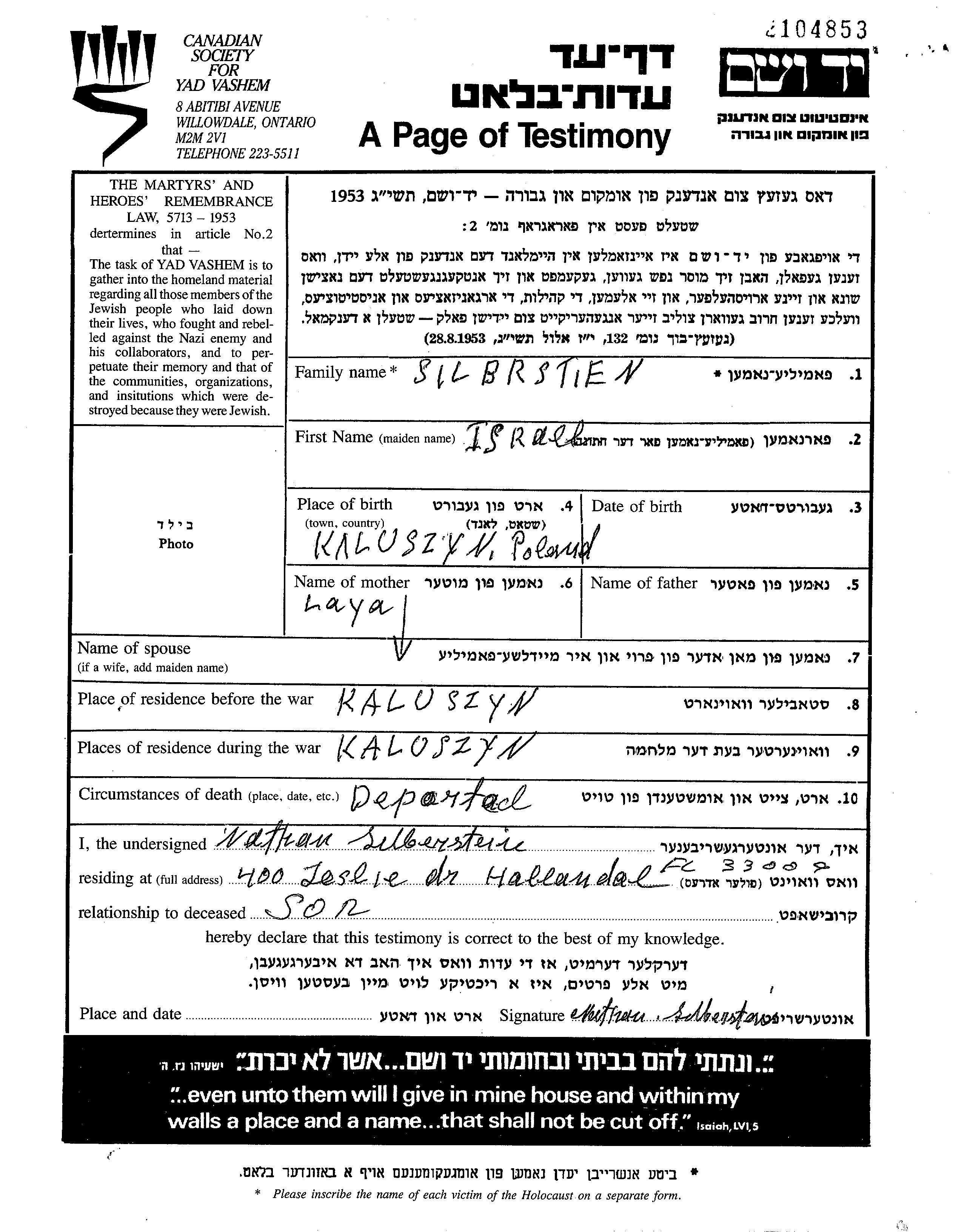 Silberstein Israel Kaluszyn, Poland Page of Testimony