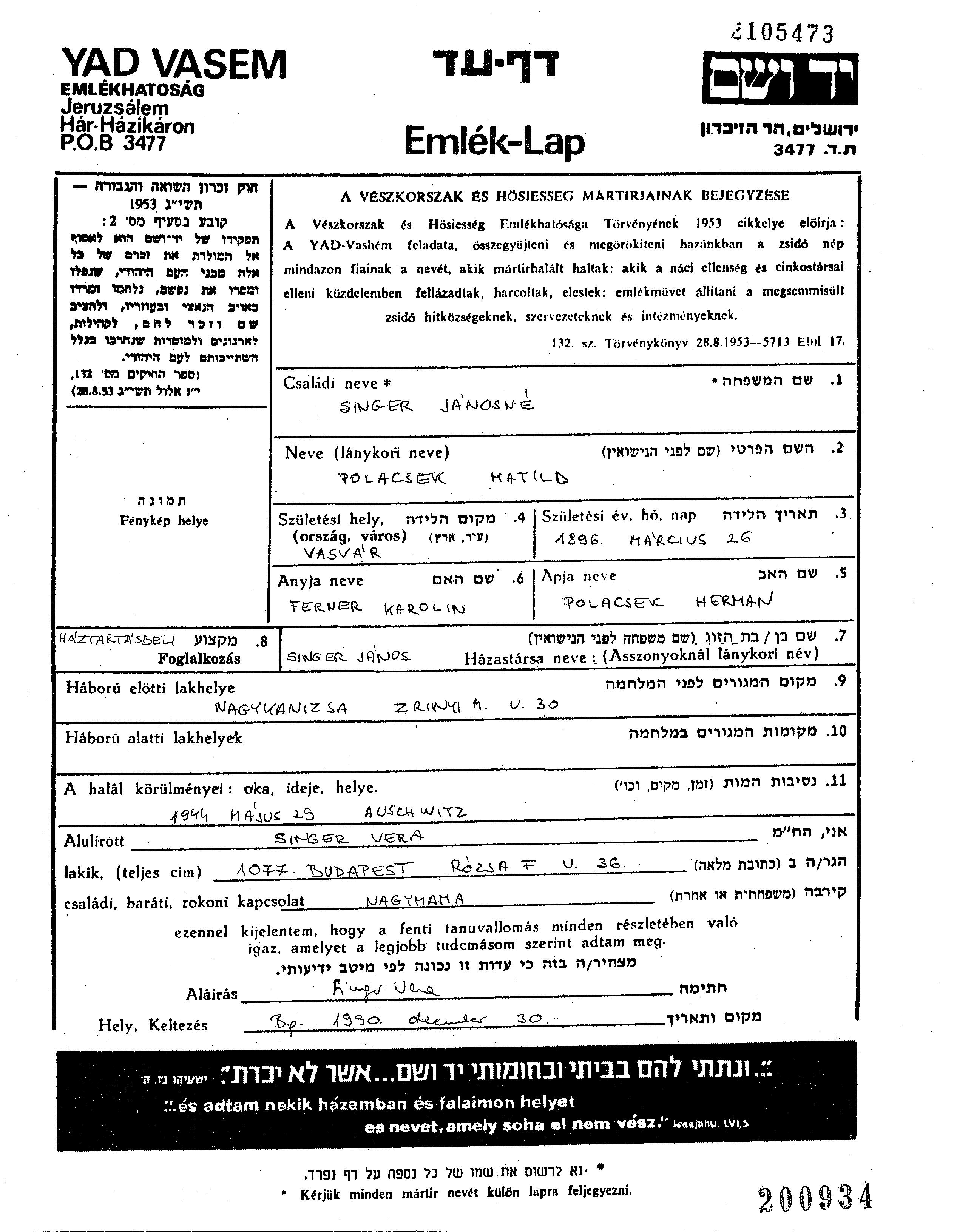 Singer Matild 1896 Nagykanizsa, Hungary Page of Testimony