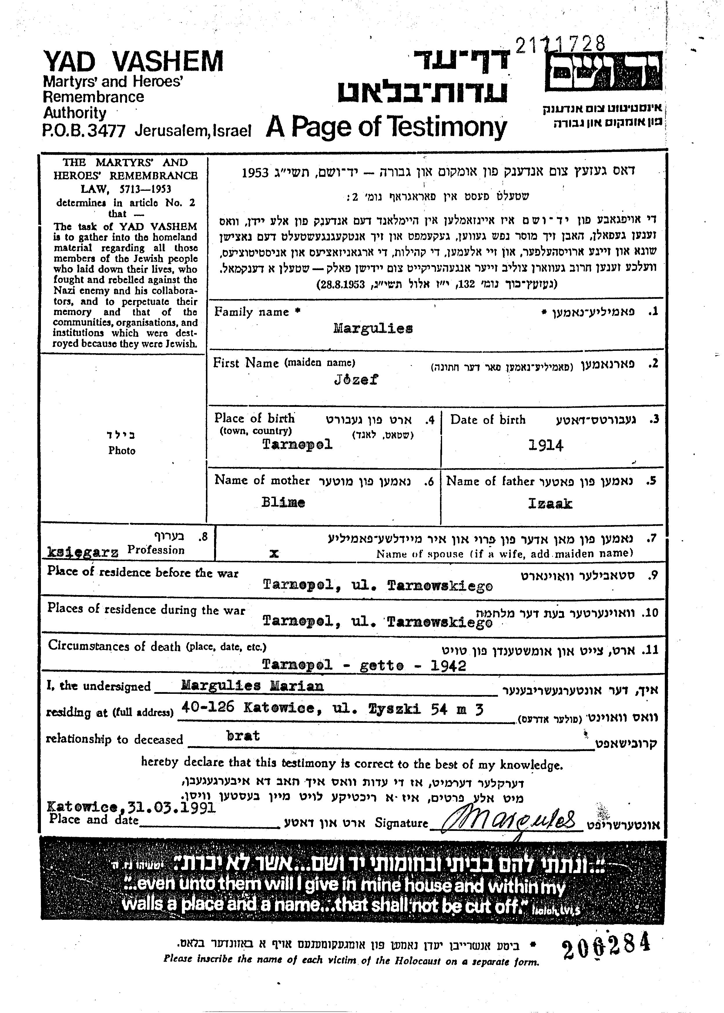 Margulies Jozef 1914 Tarnopol, Poland Page of Testimony