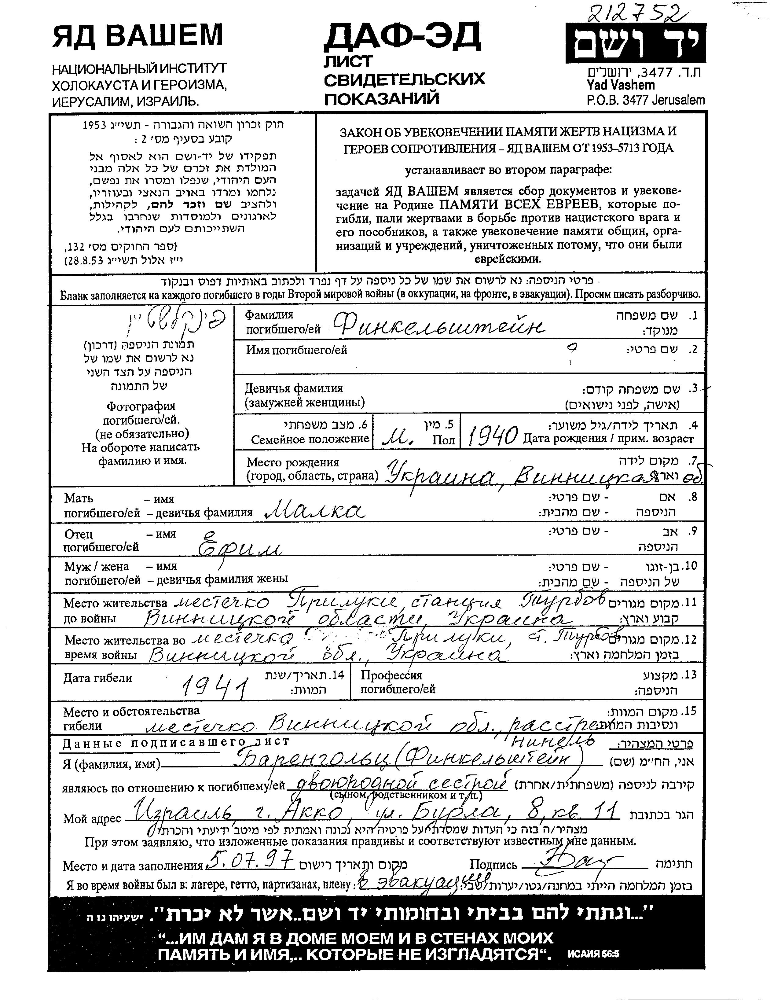 First name unknown Finkelshtein was born in Vinnitsa, Ukraine (USSR), 1940 to Yefim and Malka. She was child. Prior to WWII she lived in Turbov, Ukraine (USSR). During the war she was in Turbov, Ukraine (USSR). She was murdered in the Shoah. Place of death: Turbov, Ukraine (USSR), 1941.
