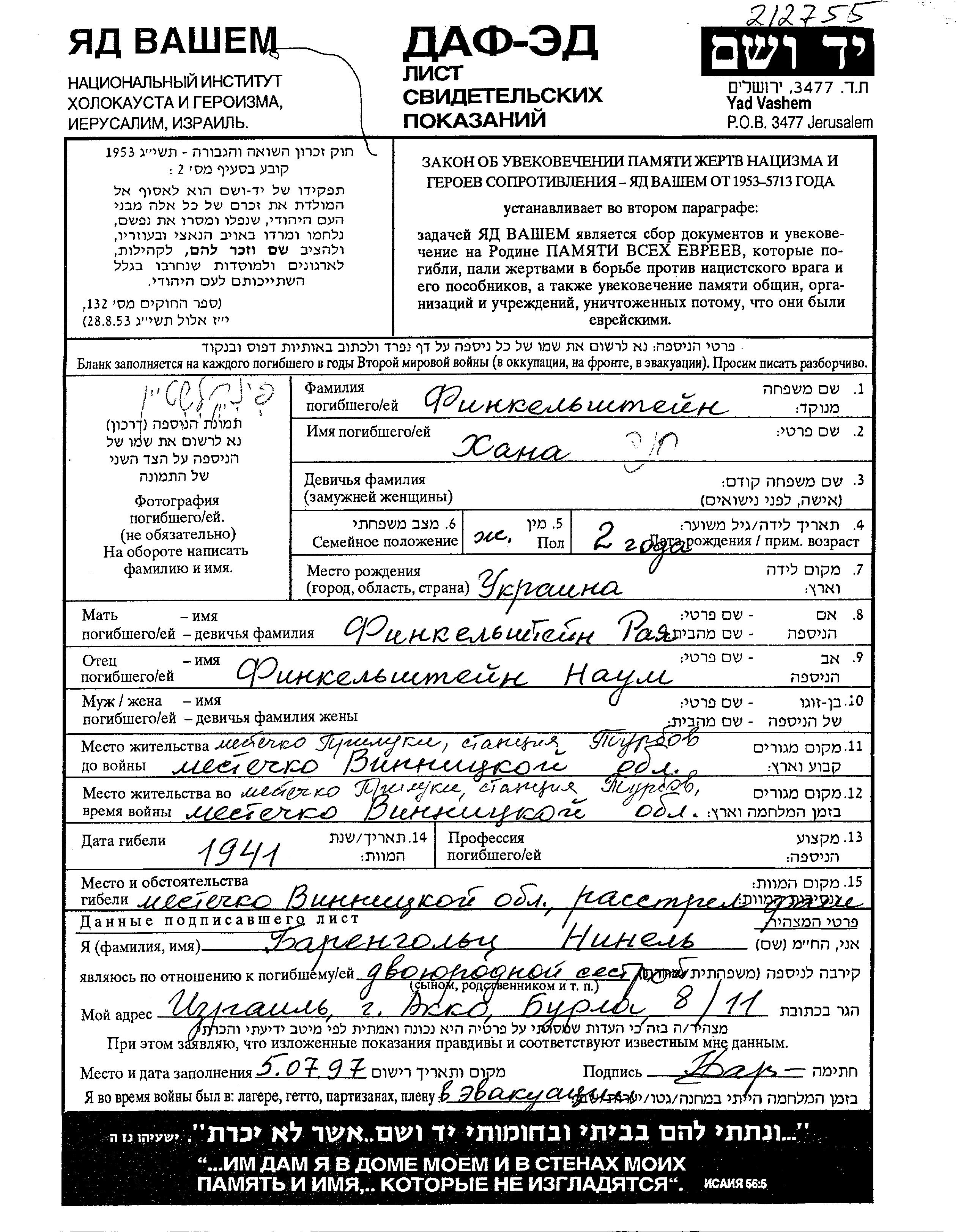 Khana Finkelshtein was born in Vinnitsa, Ukraine (USSR), 1939 to Naum and Raia. She was child. Prior to WWII she lived in Turbov, Ukraine (USSR). During the war she was in Turbov, Ukraine (USSR). Khana was murdered in the Shoah. Place of death: Turbov, Ukraine (USSR), 1941.