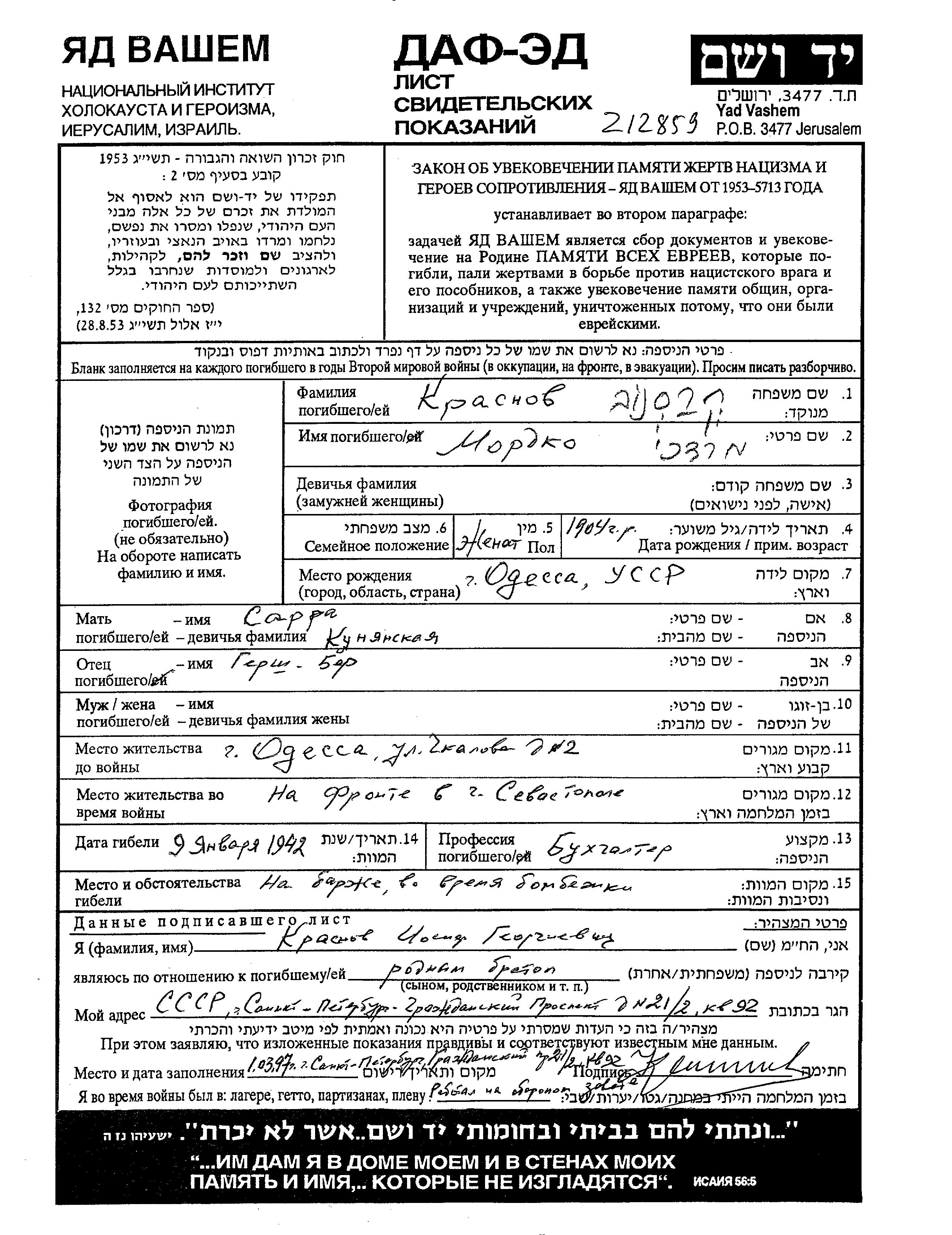 Krasnov Mordko 1904 Odessa, Ukraine (USSR) Page of Testimony