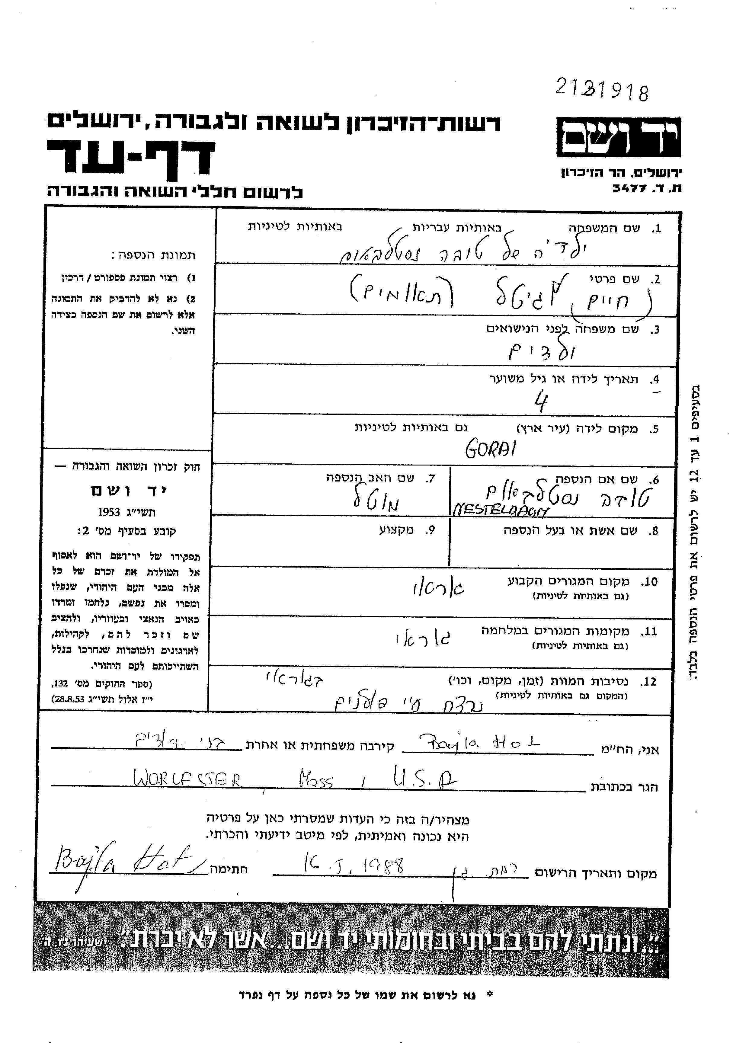 Yad Vashem - Pages of Testimony Names Memorial Collection