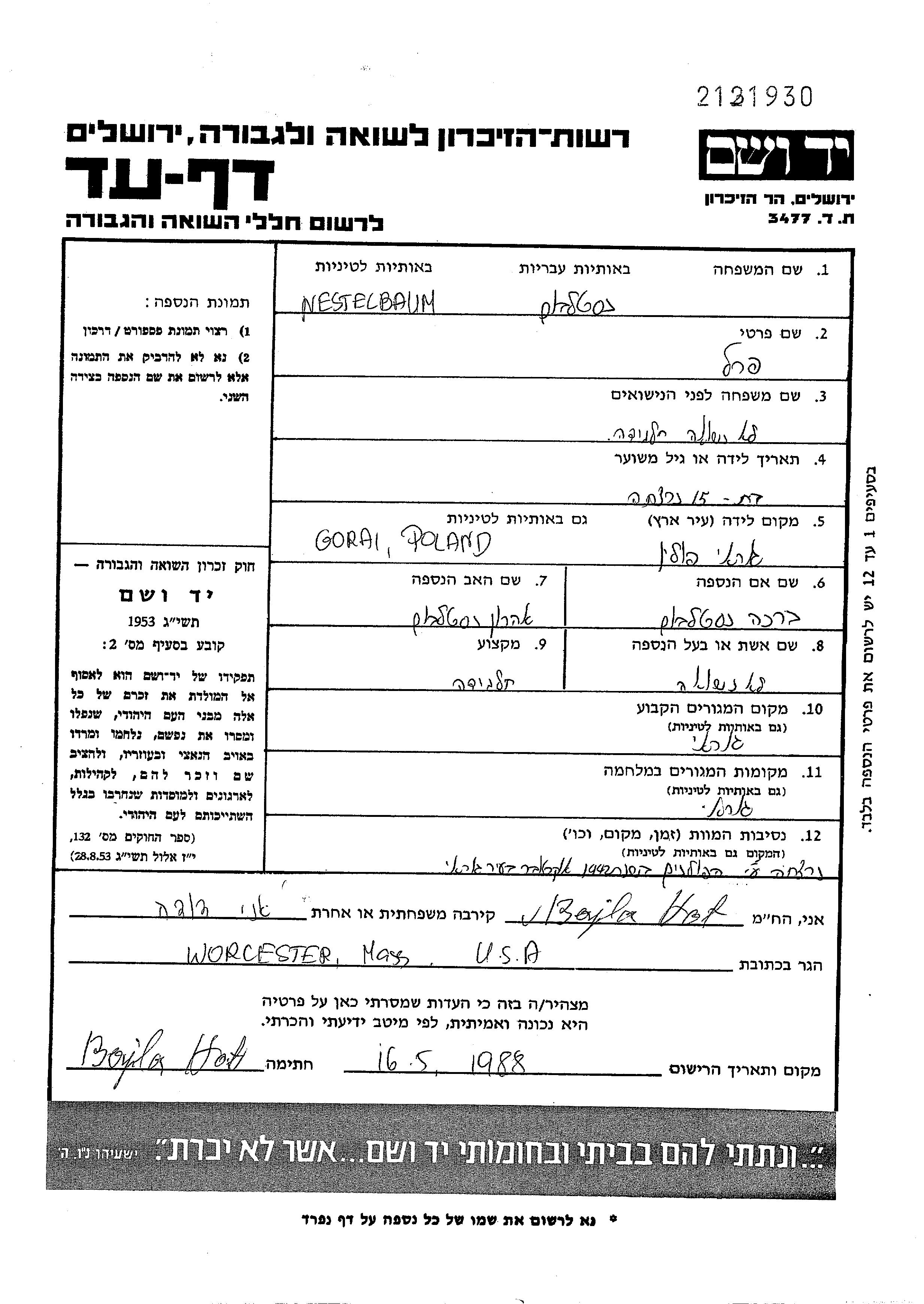 Perl Nestelboim was born in Goraj, Poland, 1927 to Aharon and Bracha. She was a pupil and child. Prior to WWII she lived in Goraj, Poland. During the war she was in Goraj, Poland. Perl was murdered in the Shoah. Place of death: Goraj, Poland, 1942.