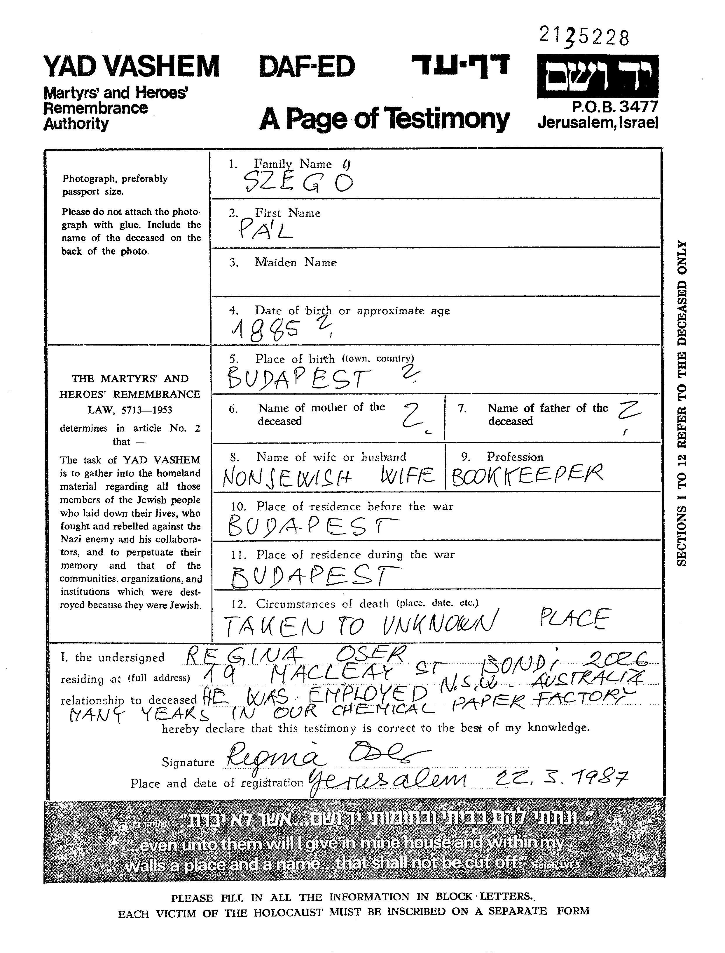 Szego Pal Budapest, Hungary Page of Testimony