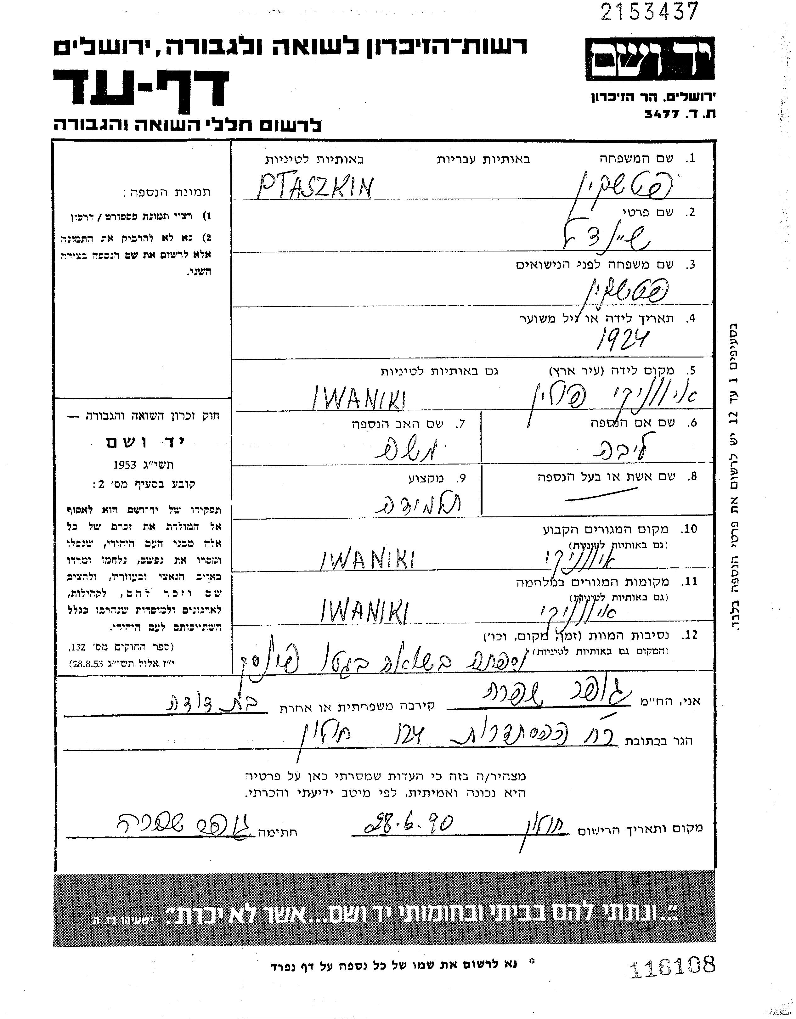 Sheindl Ptaszkin was born in Iwaniki, Poland, 1924 to Moshe and Liba nee Vatman. She was a pupil and single. Prior to WWII she lived in Iwaniki, Poland. During the war she was in Iwaniki, Poland. Sheindl was murdered in the Shoah. Place of death: Pinsk, Poland.