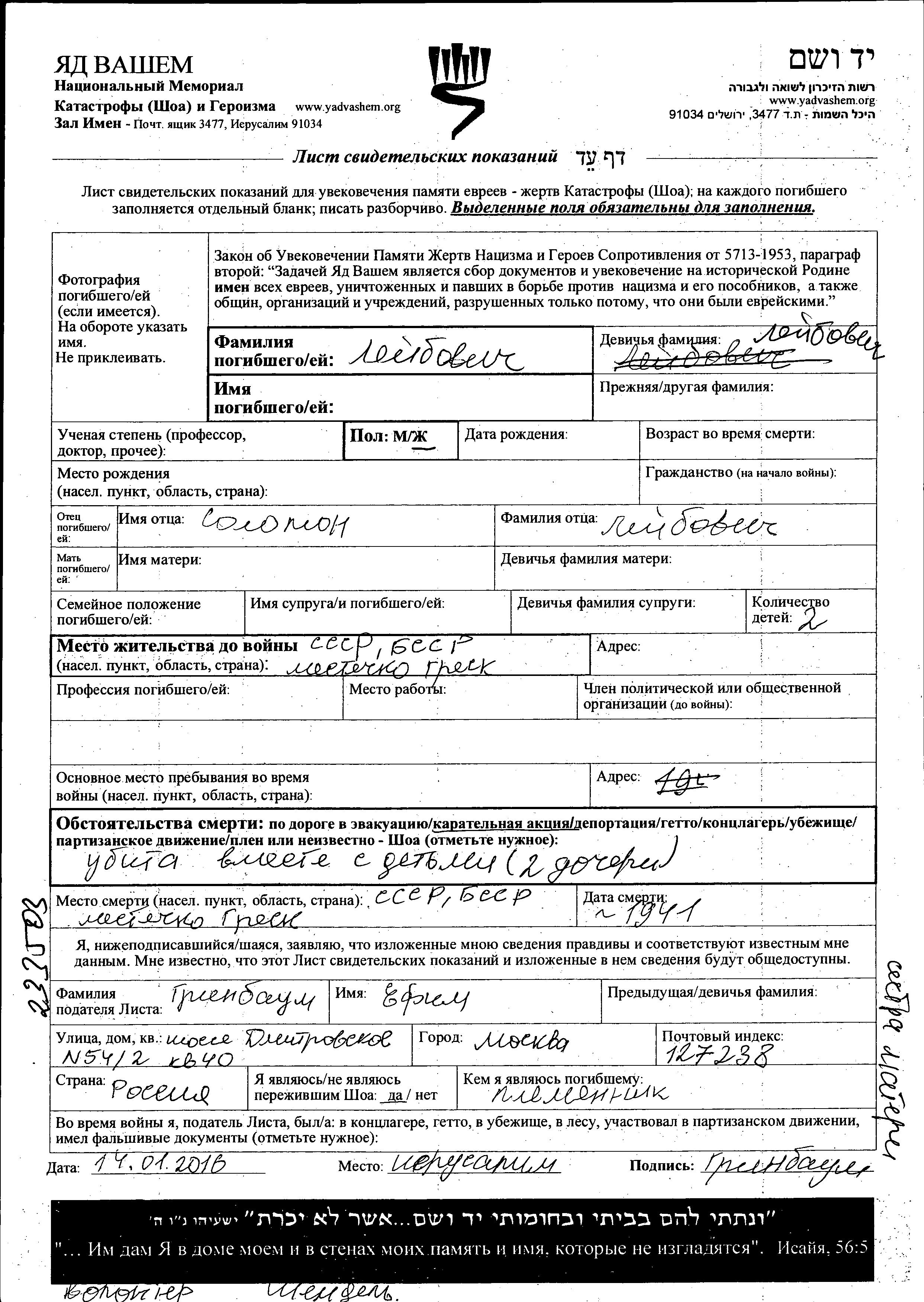 First name unknown Leybovich was born to Solomon. Prior to WWII she lived in Gresk, Belorussia (USSR). During the war she was in Gresk, Belorussia (USSR). She was murdered in the Shoah. Place of death: Gresk, Belorussia (USSR), 1941.