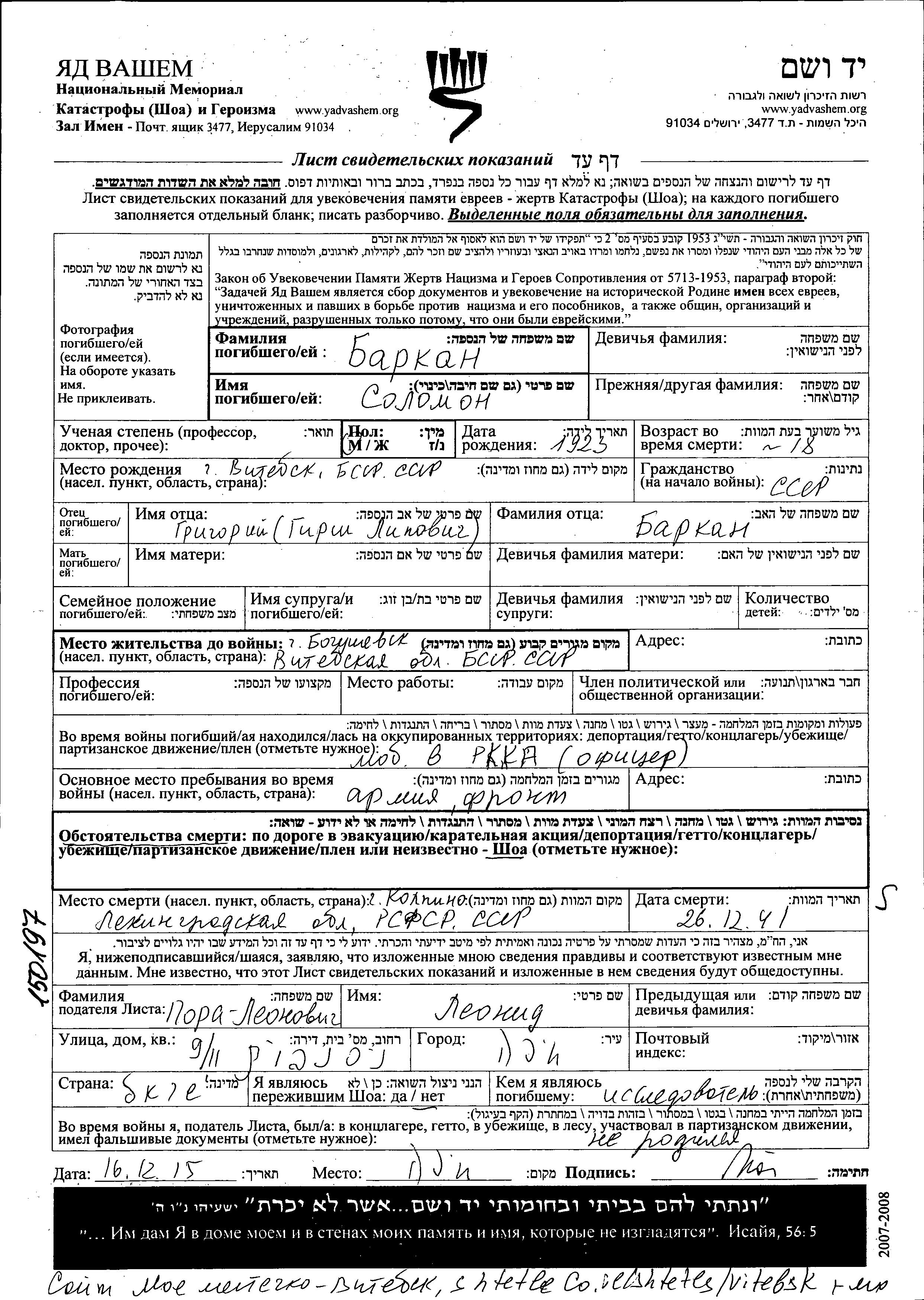 Solomon Barkan was born in Vitebsk, Belorussia (USSR), 1923 to Grigoriy Girsh. Prior to WWII he lived in Bogushevsk, Belorussia (USSR). During the war he was in the Soviet armed forces. Solomon was killed in military service in WWII. Place of death: Kolpino, Russia (USSR), 26/12/1941.