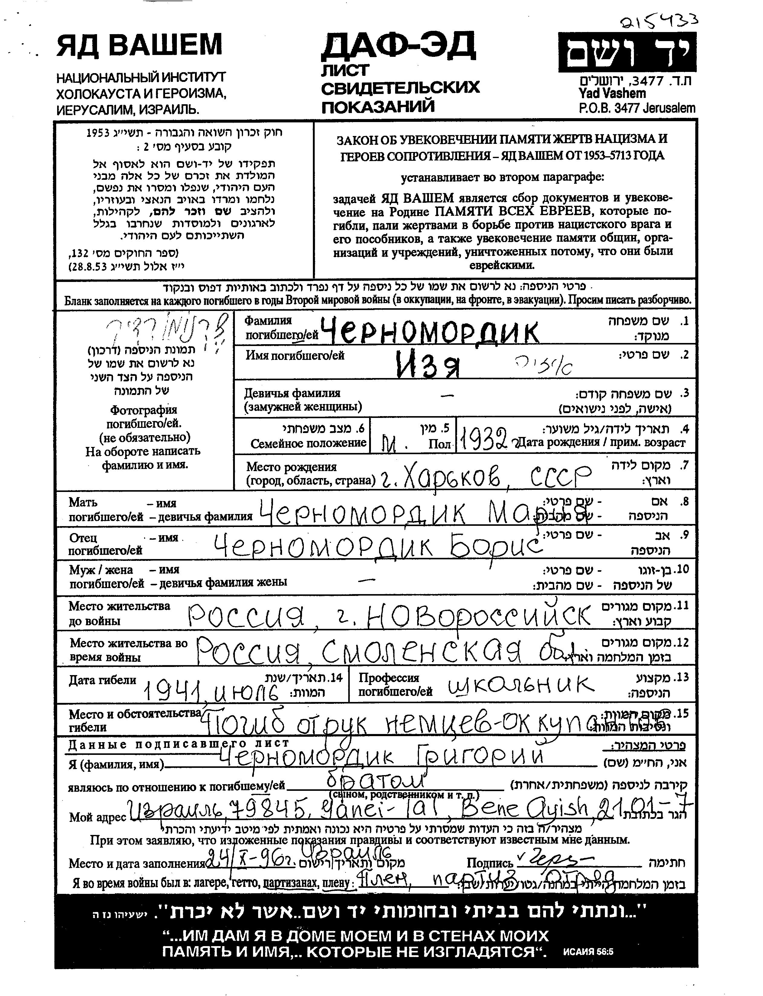 Izya Chernomordik was born in Kharkov, Ukraine (USSR), 1932 to Boris and Maria nee Zisman. He was a pupil and child. Prior to WWII he lived in Novorossiysk, Russia (USSR). During the war he was in Smolensk, Russia (USSR). Izya was murdered in the Shoah. Place of death: unknown, 1941.