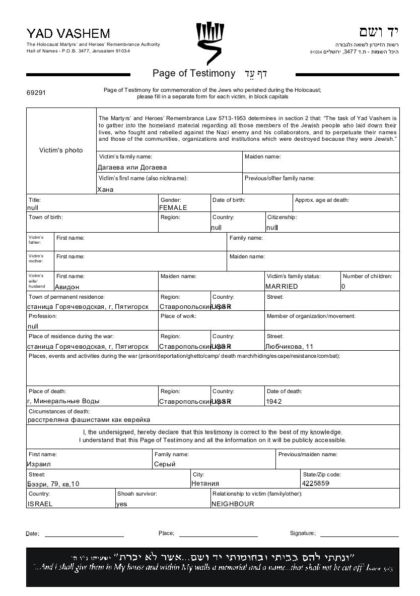Khana Dagayeva. She was married to Avidon. Prior to WWII she lived in Goryachevodskaya, Russia (USSR). During the war she was in Goryachevodskaya, Russia (USSR). Khana was murdered in the Shoah. Place of death: Mineralnye Vody, Russia (USSR), 1942.