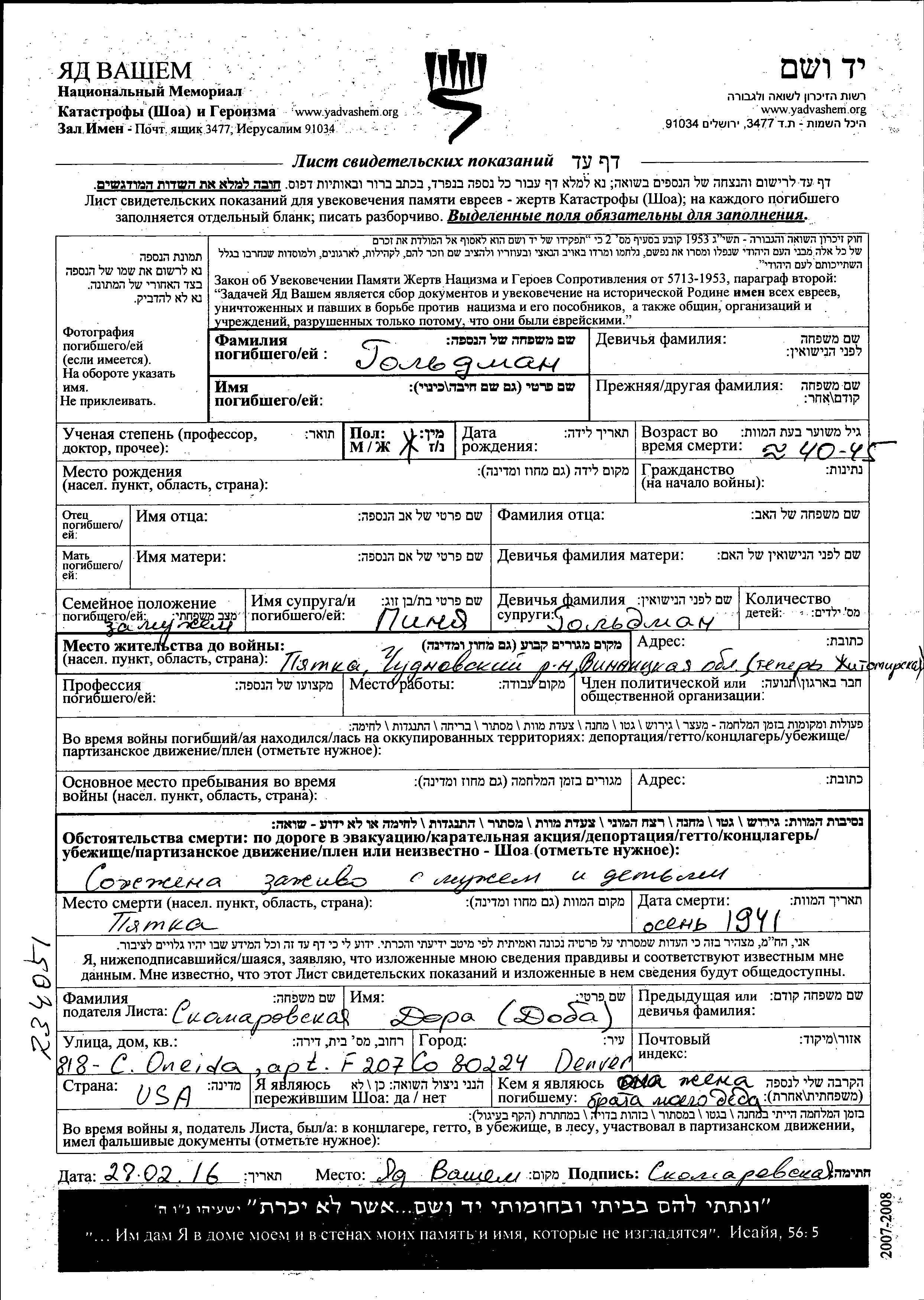 First name unknown Goldman. She was married to Pinya. Prior to WWII she lived in Pyatka, Ukraine (USSR). During the war she was in Pyatka, Ukraine (USSR). She was murdered in the Shoah. Place of death: Pyatka, Ukraine (USSR), 10/1941.