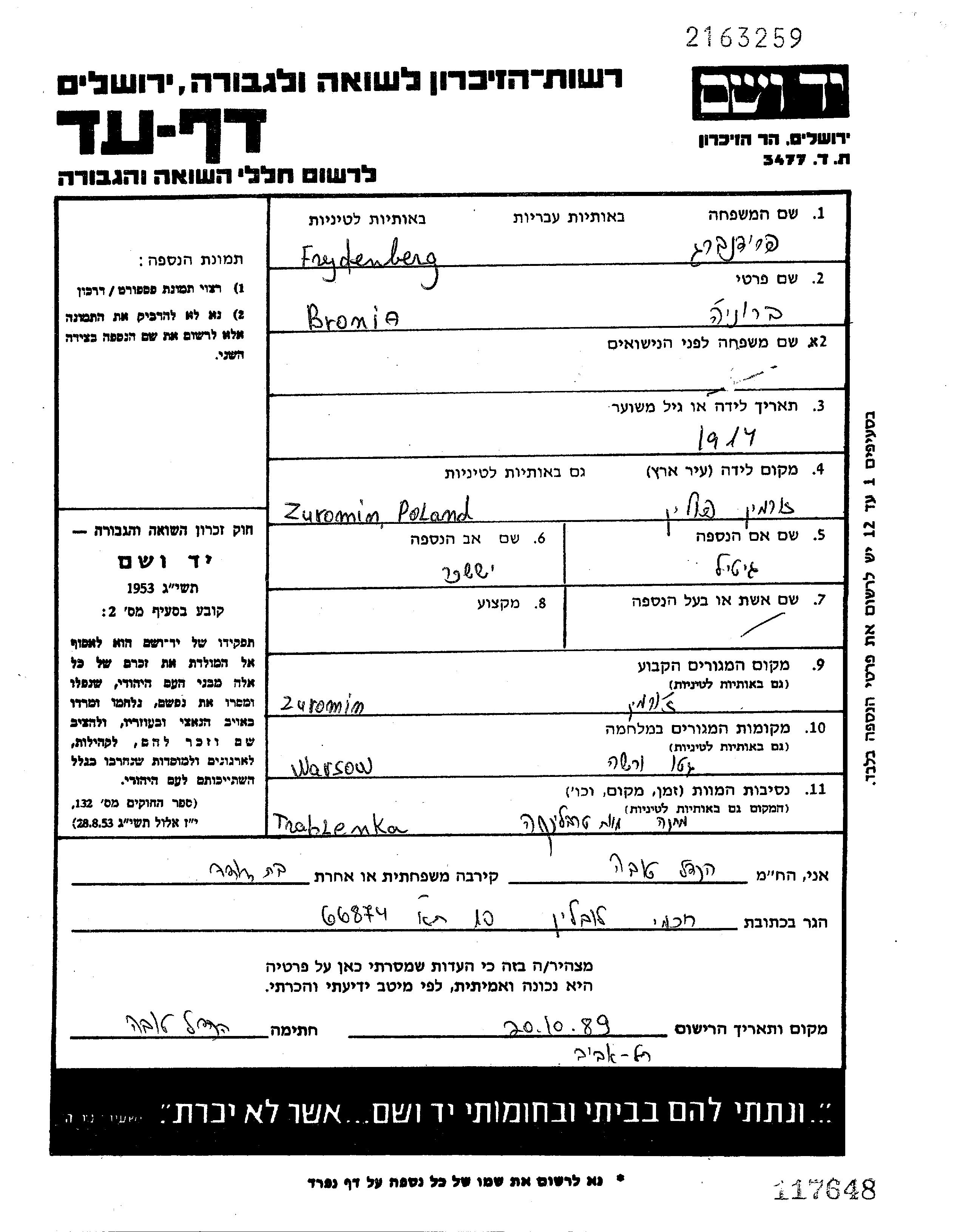 Frydenberg Bronia 1914 Zuromin, Poland Page of Testimony