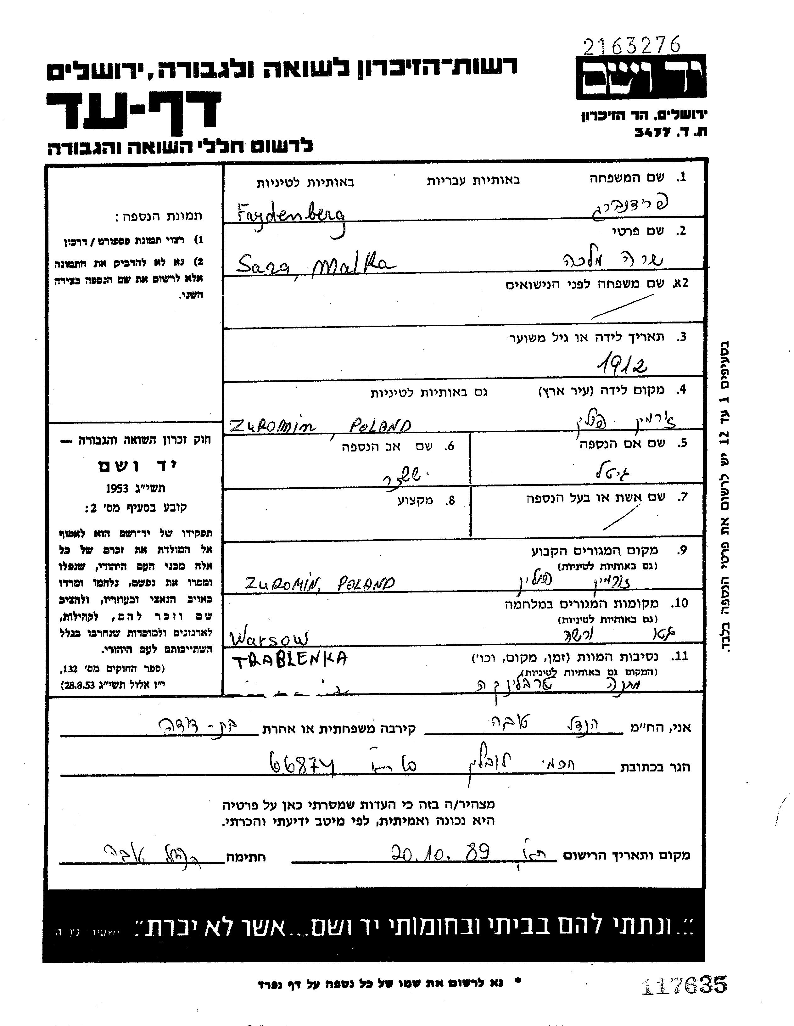 Frydenberg Malka Sara 1912 Zuromin, Poland Page of Testimony