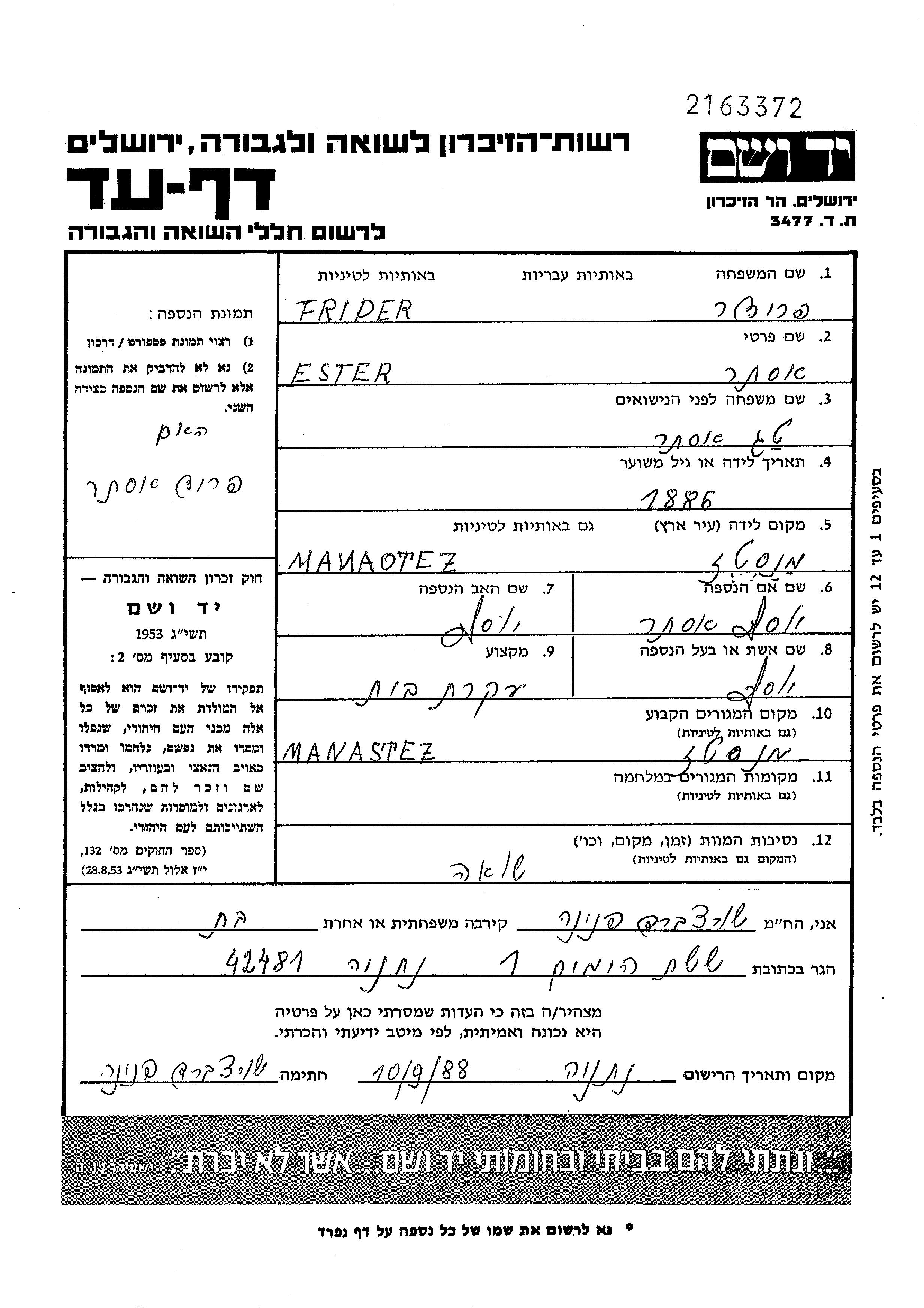 Ester Frider nee Tag was born in Manasterz, Poland, 1886. She was a housewife and married to Yosef. Prior to WWII she lived in Manasterz, Poland. During the war she was in Manasterz, Poland. Ester was murdered in the Shoah.