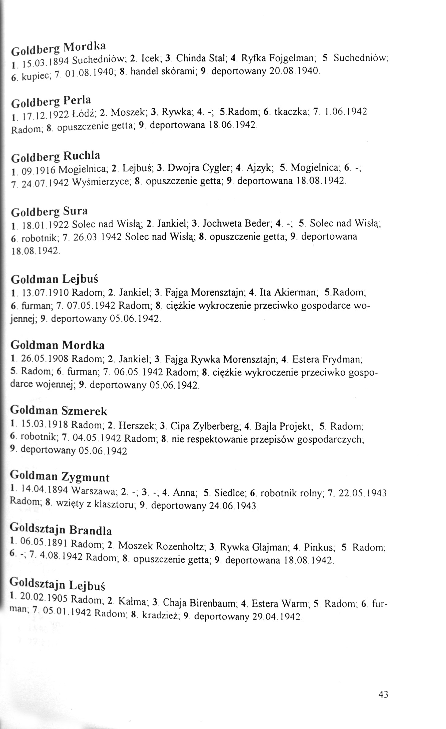 Sura Goldberg was born in Solec nad Wisla, Poland, 1922 to Jankiel and Jochweta nee Beder. She was a worker. Prior to WWII she lived in Solec nad Wisla, Poland. During the war she was in Radom, Poland.