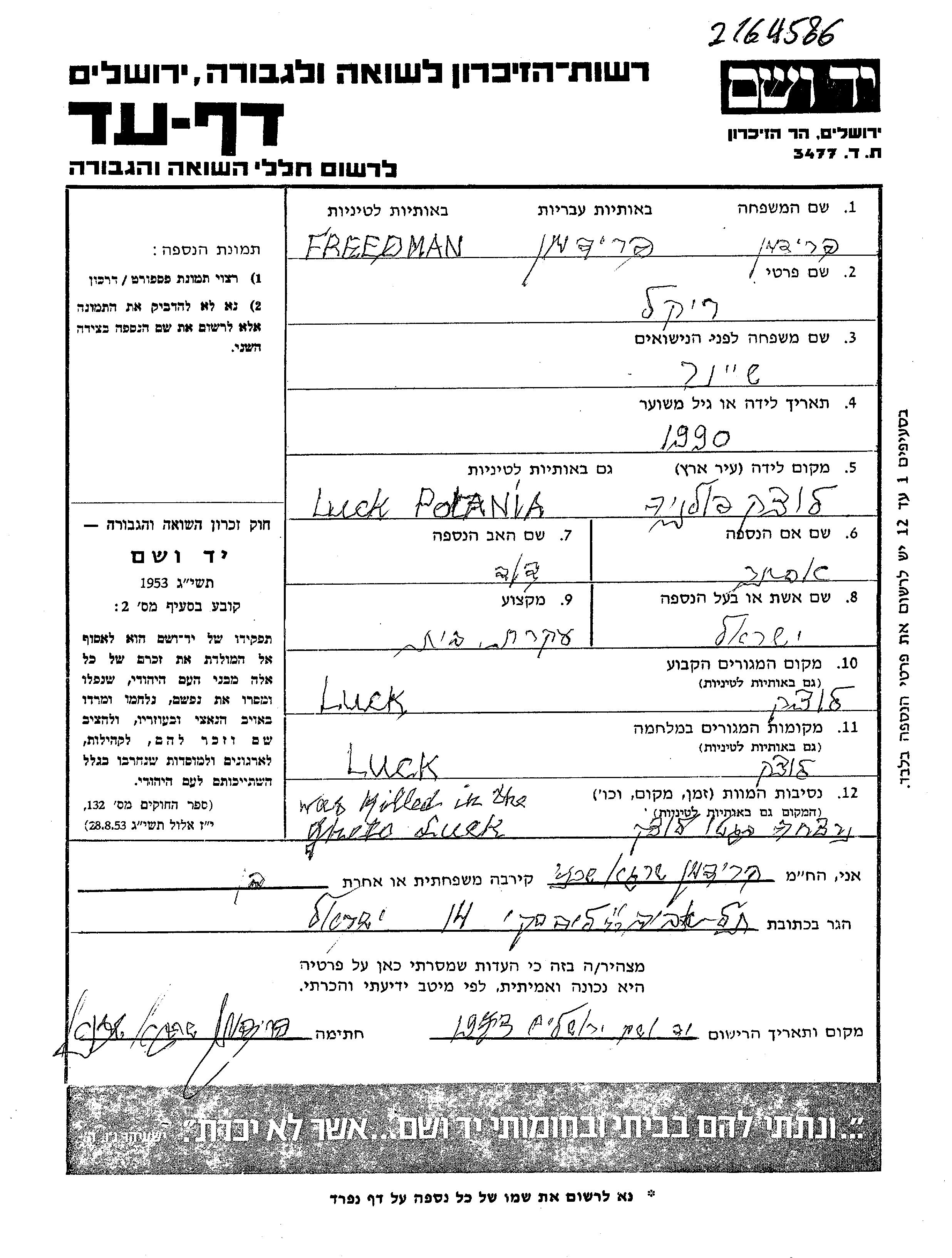 Friedman Rikel 1890 Luck, Poland Page of Testimony