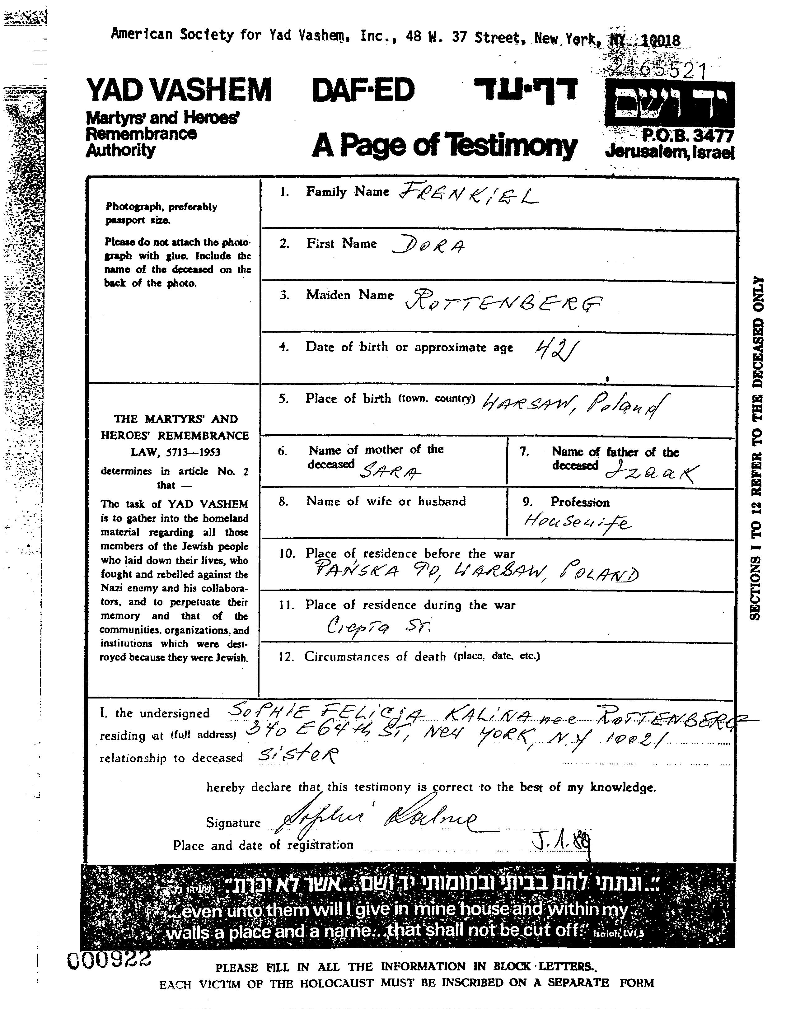 Frenkiel Dora Warszawa, Poland Page of Testimony