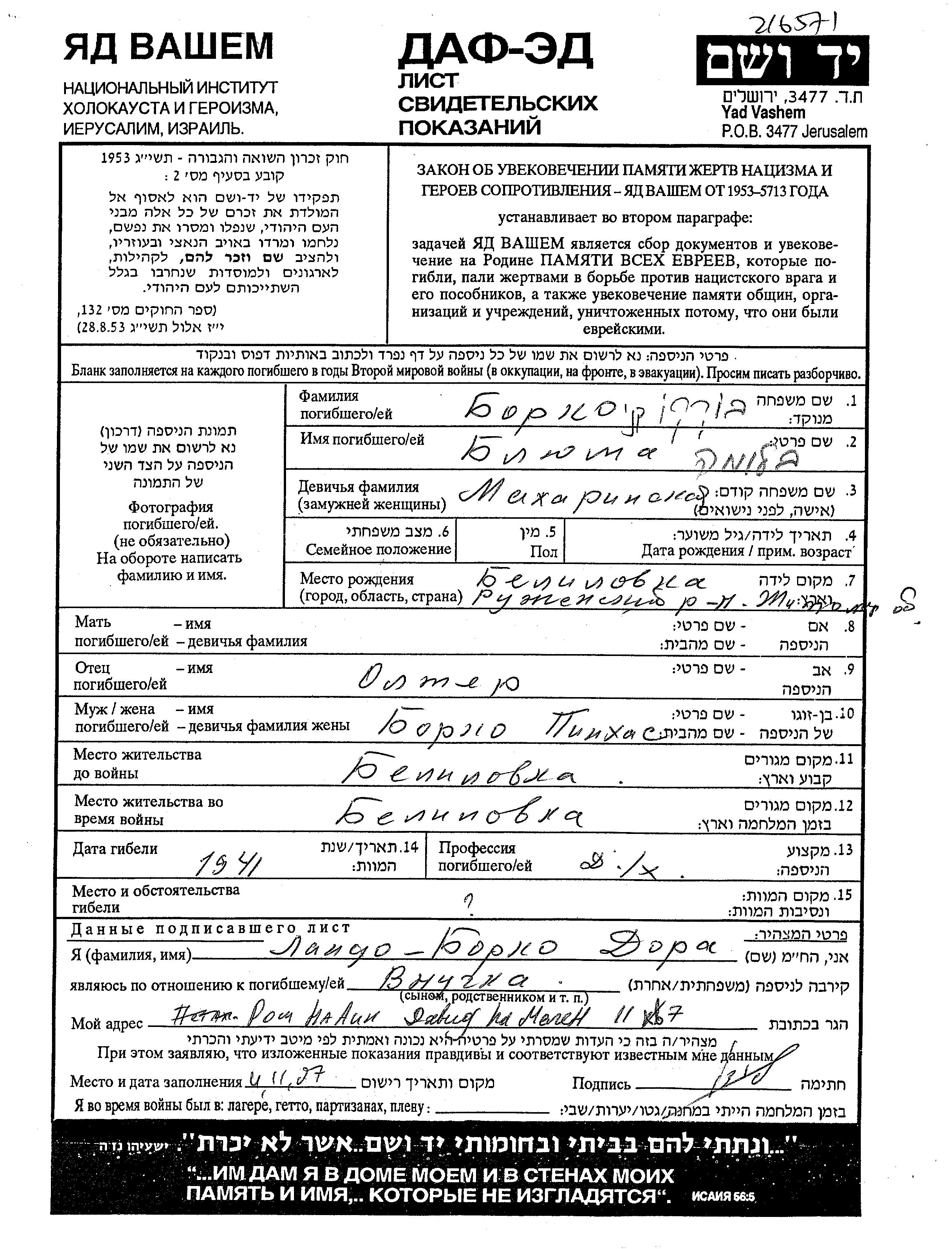 Borko Burko Blyuma Belilovka, Ukraine (USSR) Page of Testimony