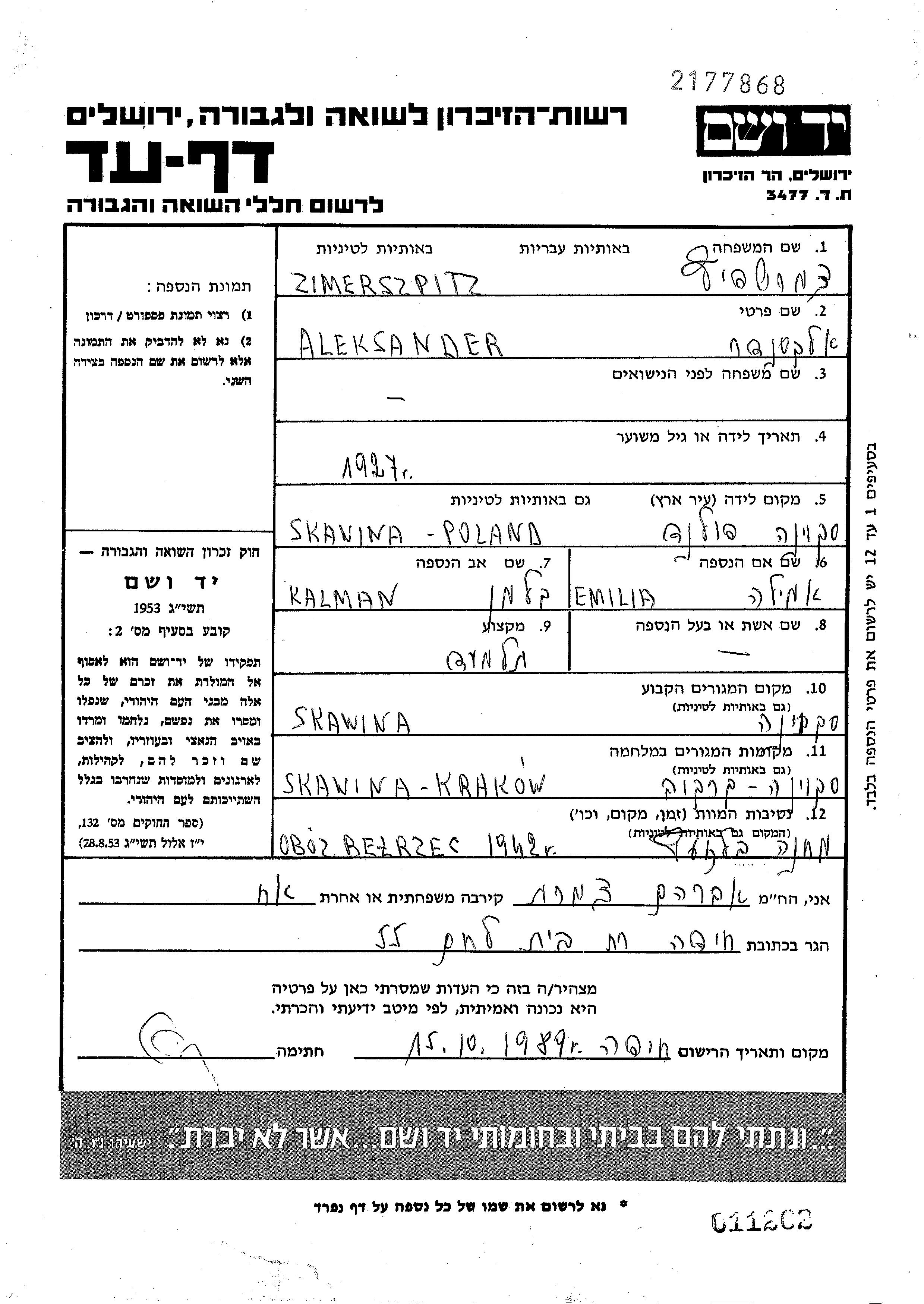 Zimerszpitz Aleksander 1927 Skawina, Poland Page of Testimony