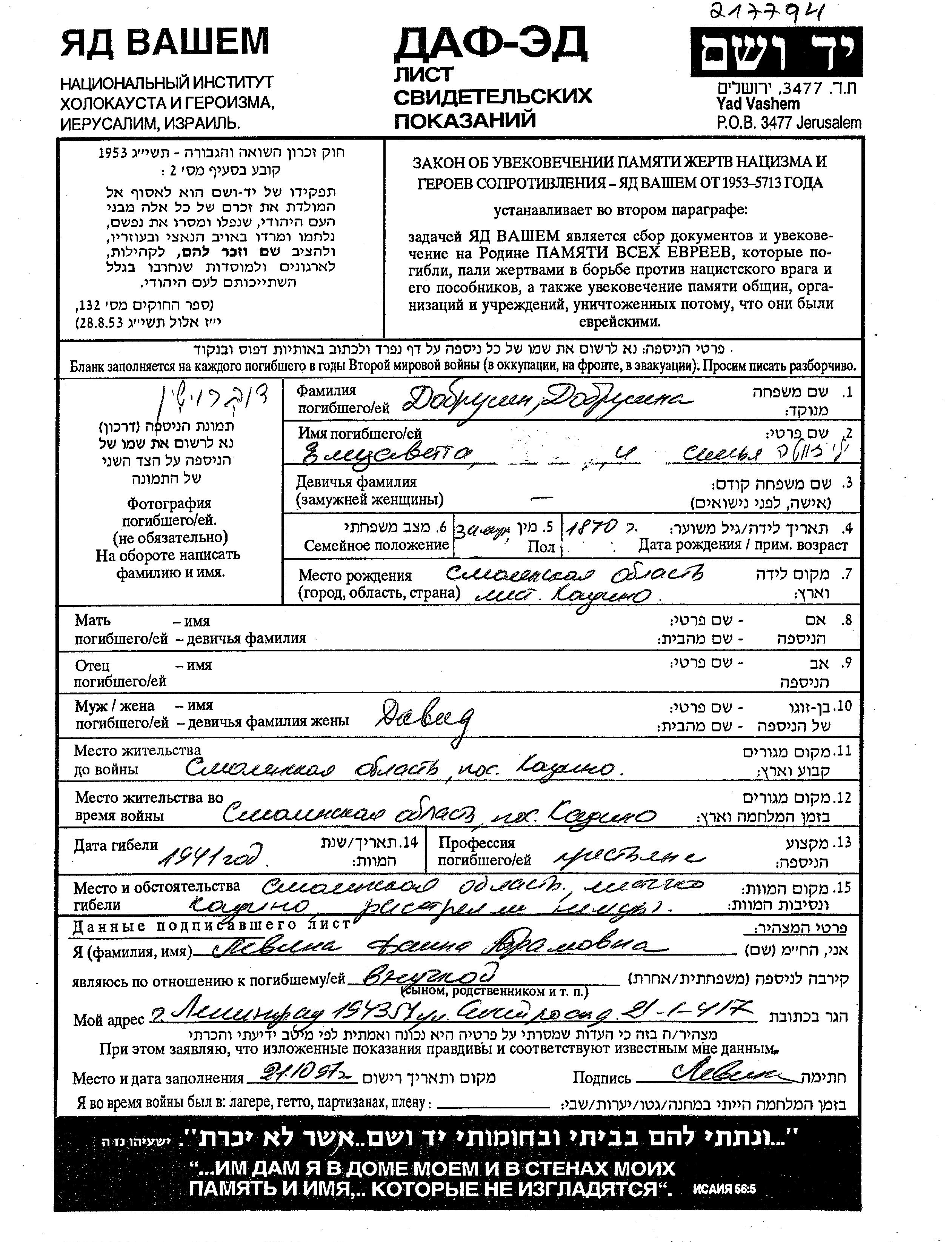 Dobrusin Yelizaveta 1870 Kadino, Russia (USSR) Page of Testimony