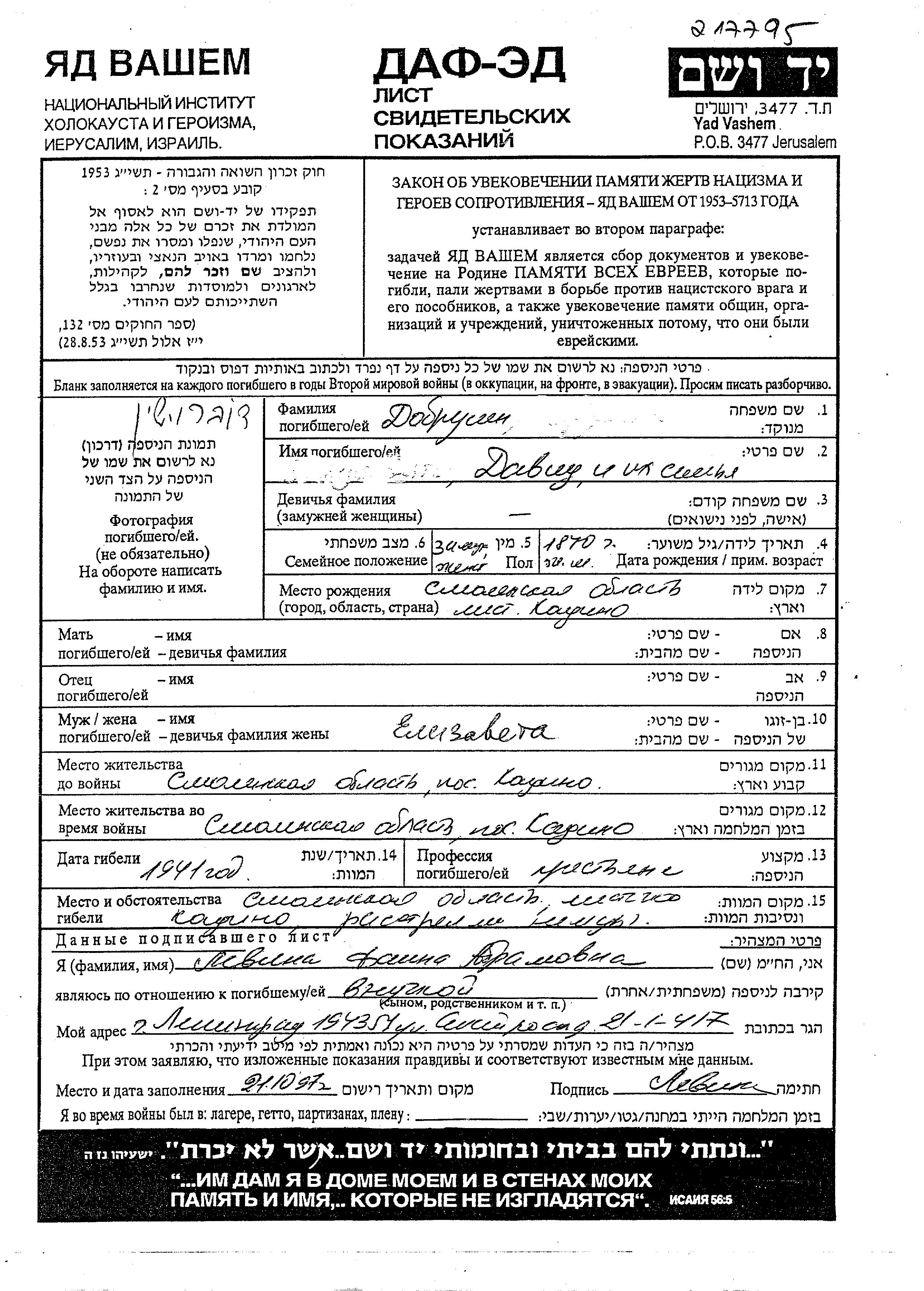 Dobrusin David 1870 Kadino, Russia (USSR) Page of Testimony