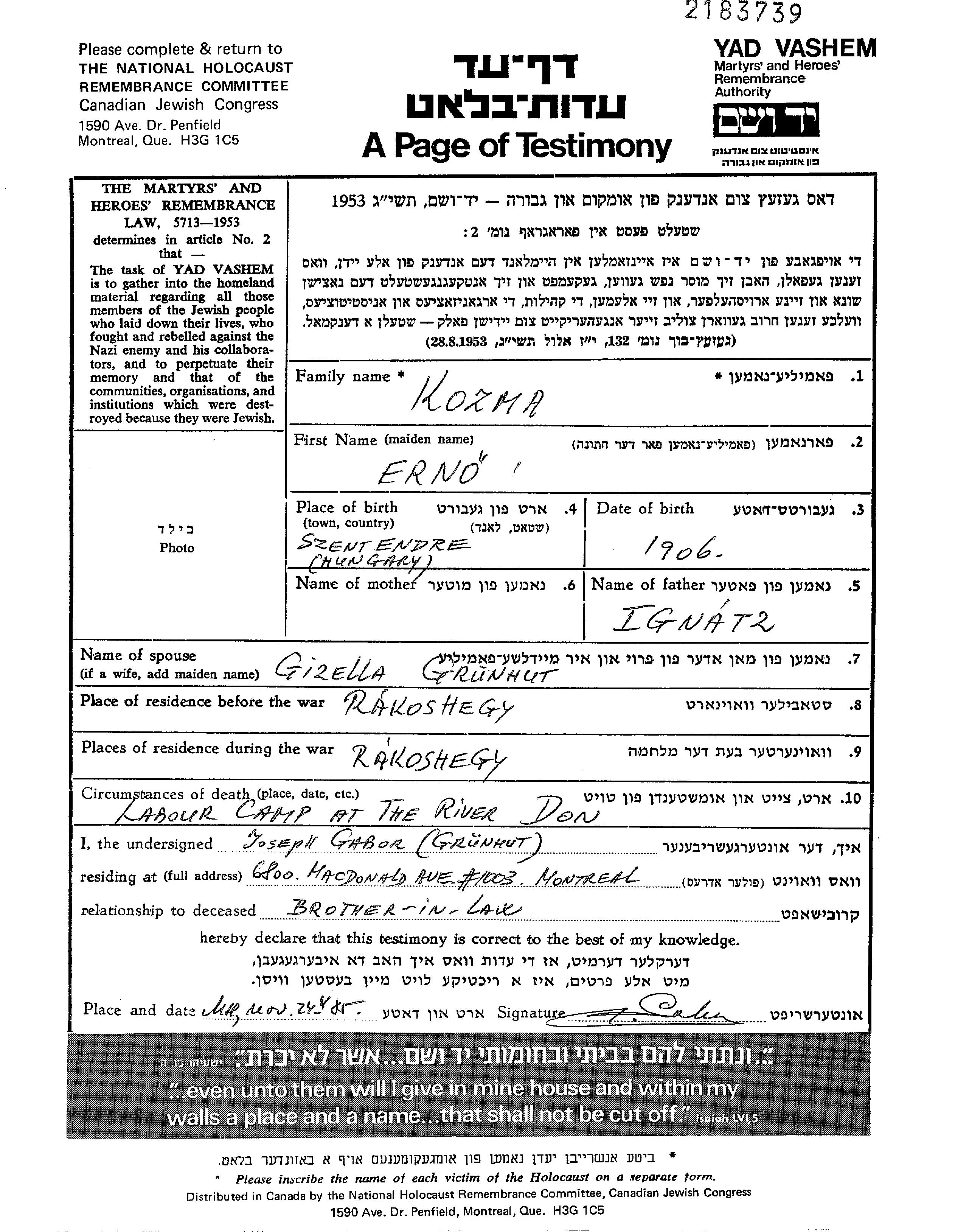 Kozma Erno 1906 Rakoshegy, Hungary Page of Testimony