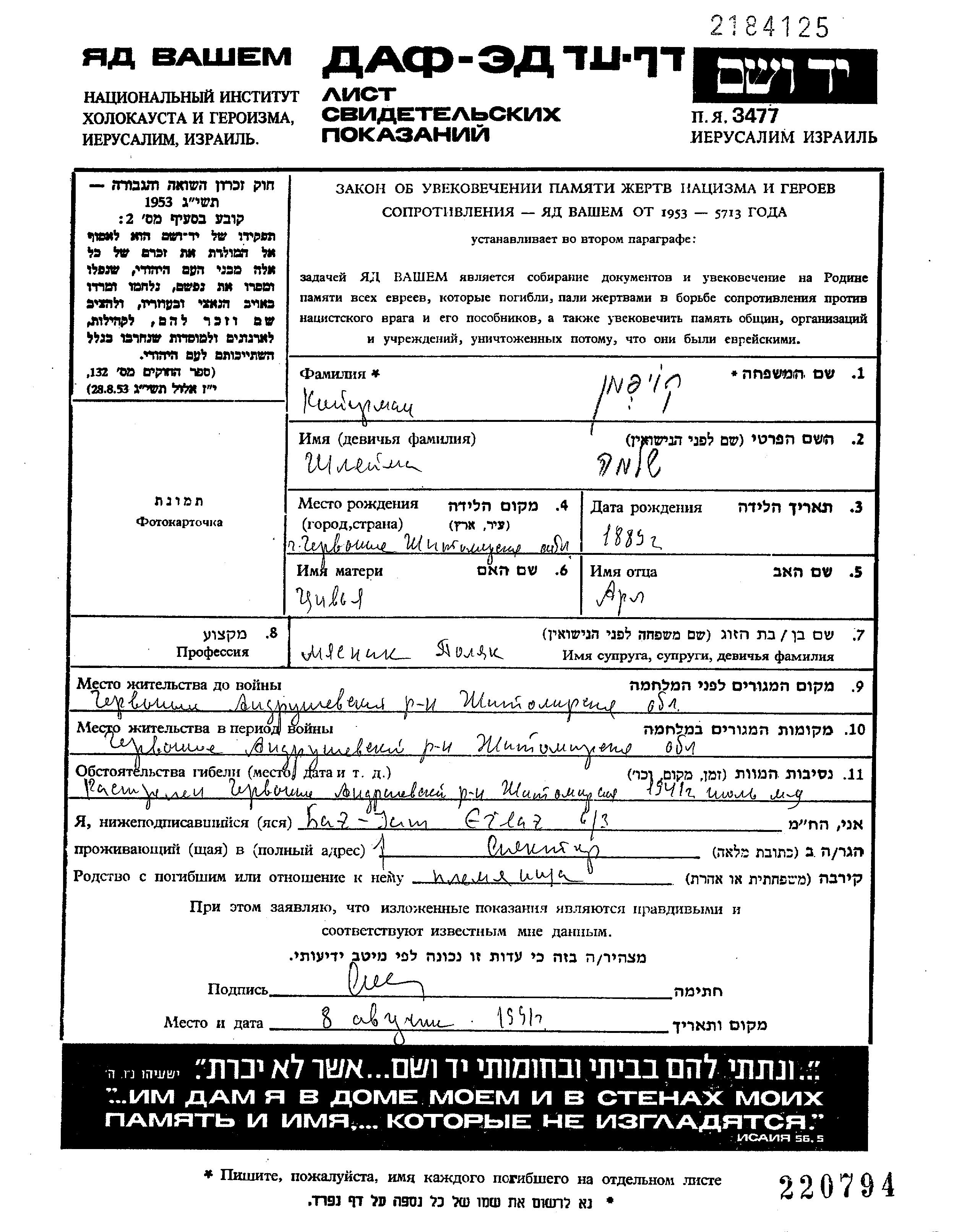 Shleima Koifman was born in Chervonoye, Ukraine (USSR), 1889 to Arl and Tziviya. He was a ritual slaughterer and married to Rukhlya. Prior to WWII he lived in Chervonoye, Ukraine (USSR). During the war he was in Chervonoye, Ukraine (USSR). Shleima was murdered in the Shoah. Place of death: Chervonoye, Ukraine (USSR), 1941.