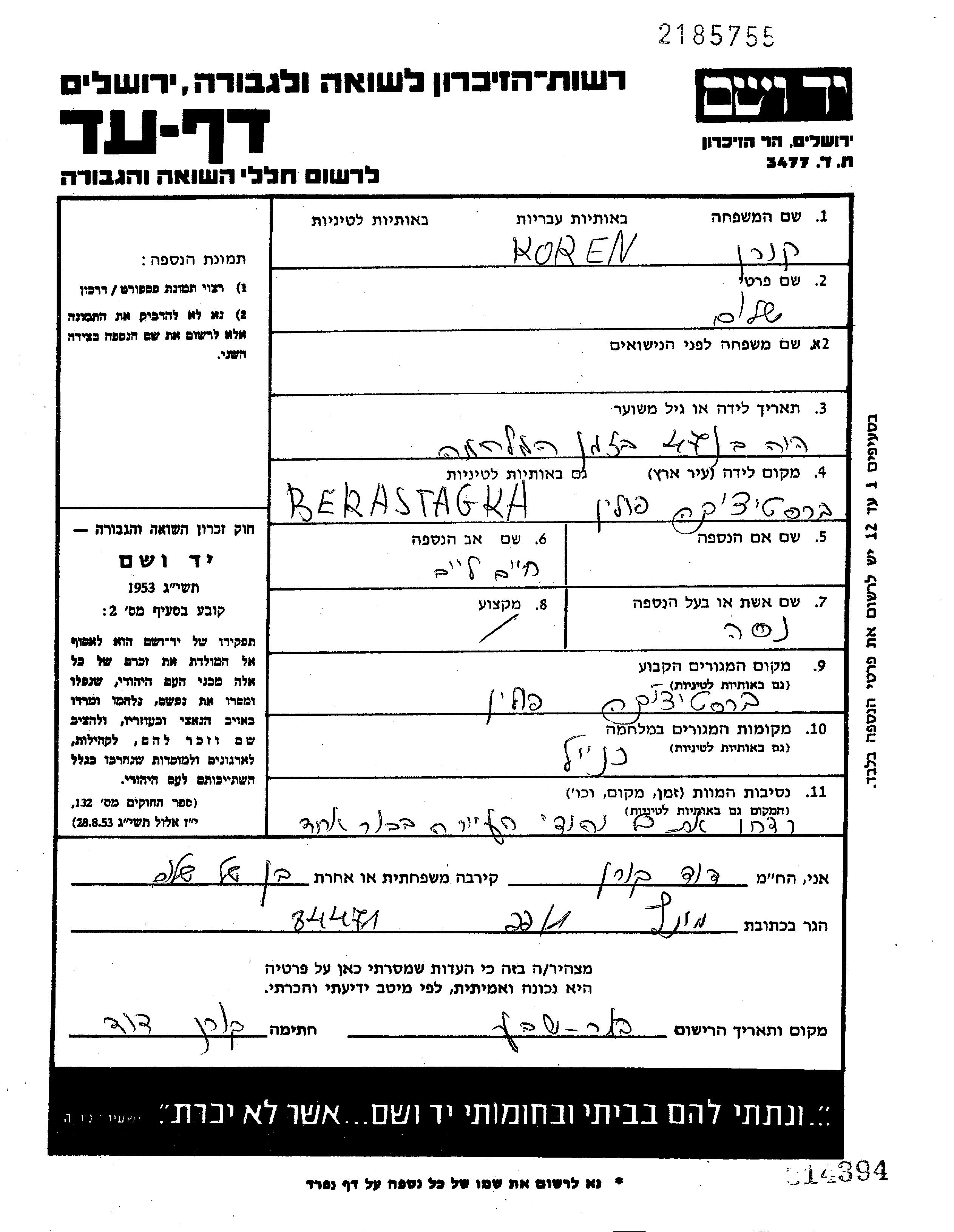 Koren Korn Shalom Beresteczko, Poland Page of Testimony