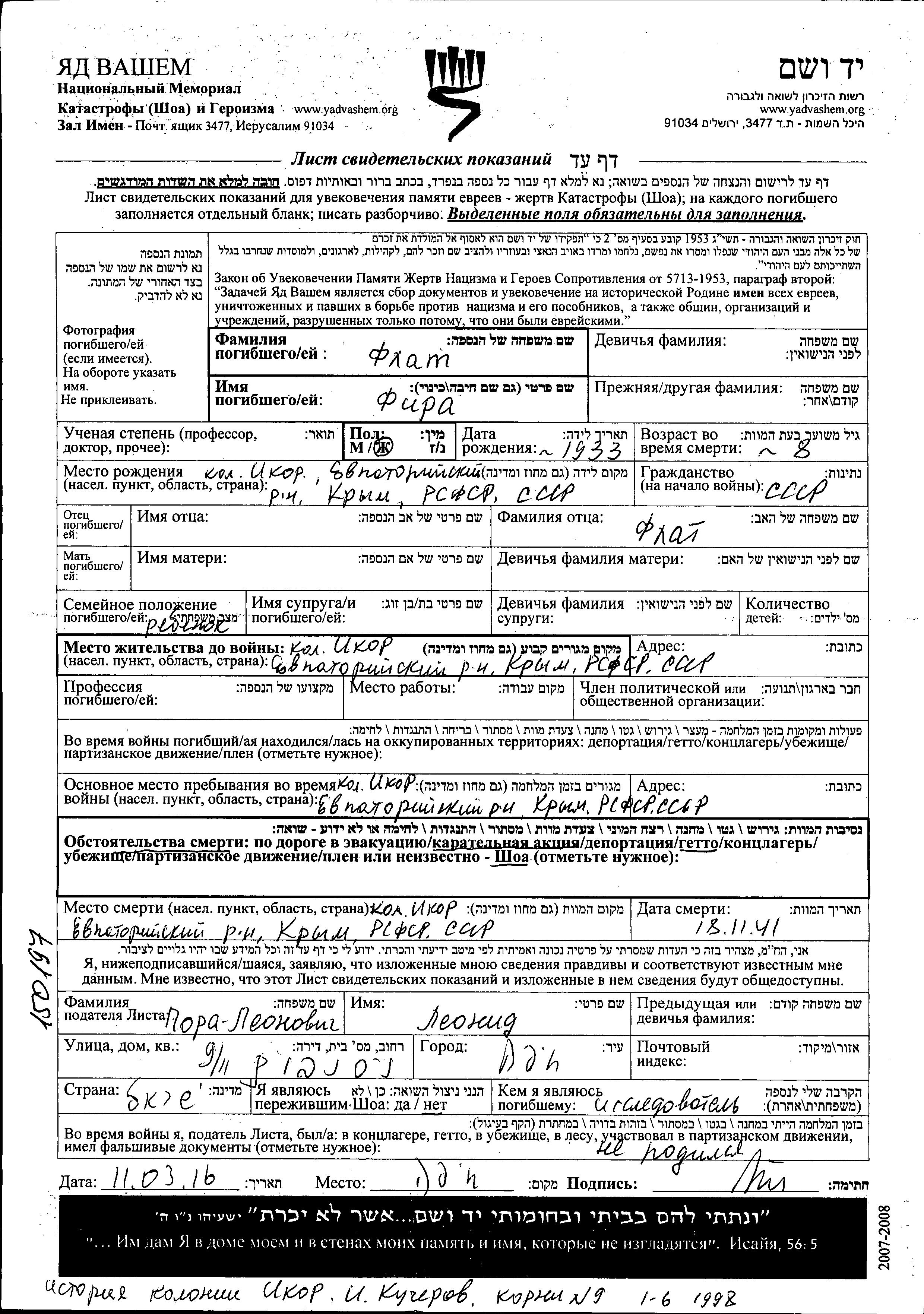 Fira Flat was born in Ikor, Russia (USSR), 1933. She was child. Prior to WWII she lived in Ikor, Russia (USSR). During the war she was in Ikor, Russia (USSR). Fira was murdered in the Shoah. Place of death: Ikor, Russia (USSR), 18/11/1941.
