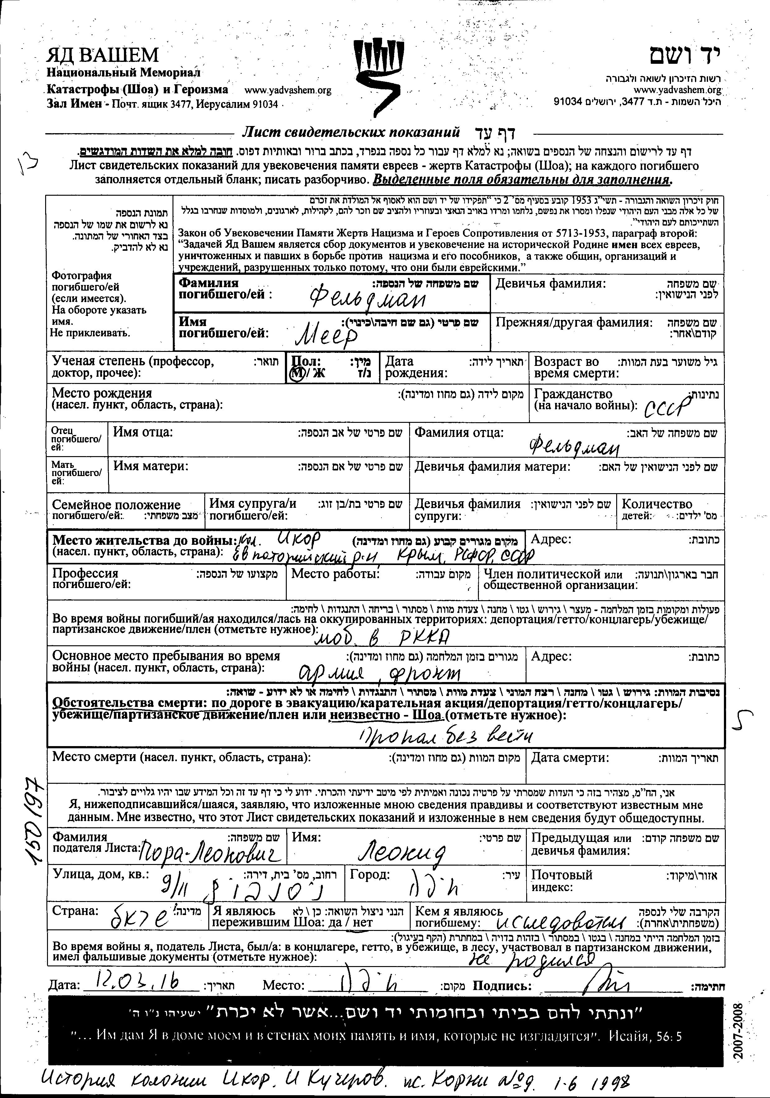 Feldman Meer Ikor, Russia (USSR) Page of Testimony